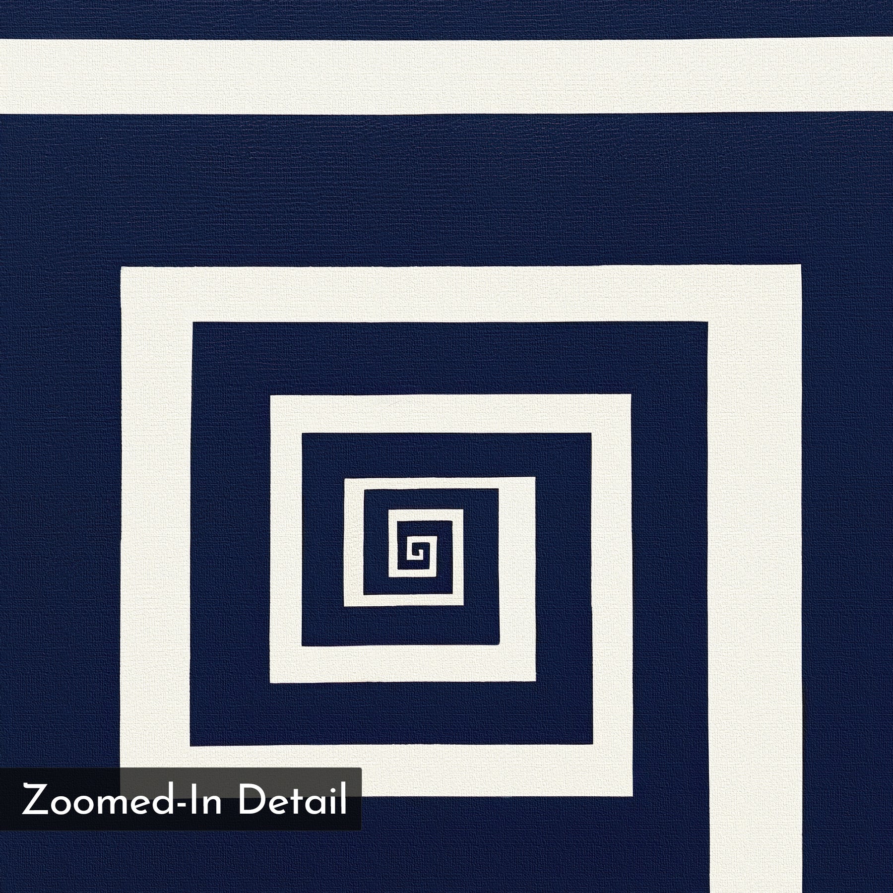 Infinite Descent Canvas Art features a geometric pattern of white concentric square spirals on a dark blue background with "Zoomed-In Detail" highlighted in a black box at the lower left, creating an abstract and minimalist wall decor piece.