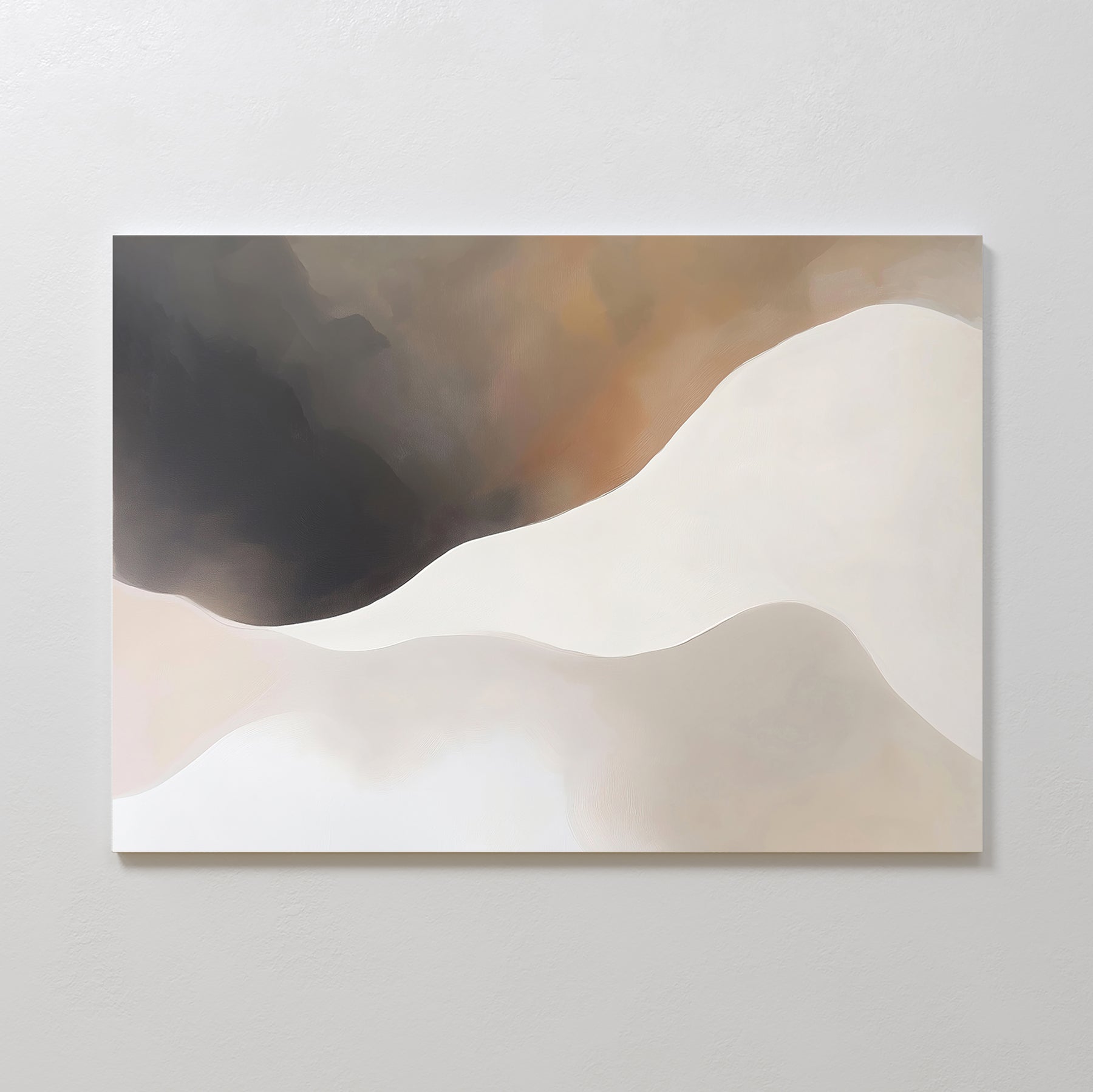 The Misty Silhouette Canvas Art – Horizontal features soft, wavy shapes in beige, cream, brown, and black. Its abstract design resembles flowing sand dunes, making it a perfect modern accent for your living room wall decor.