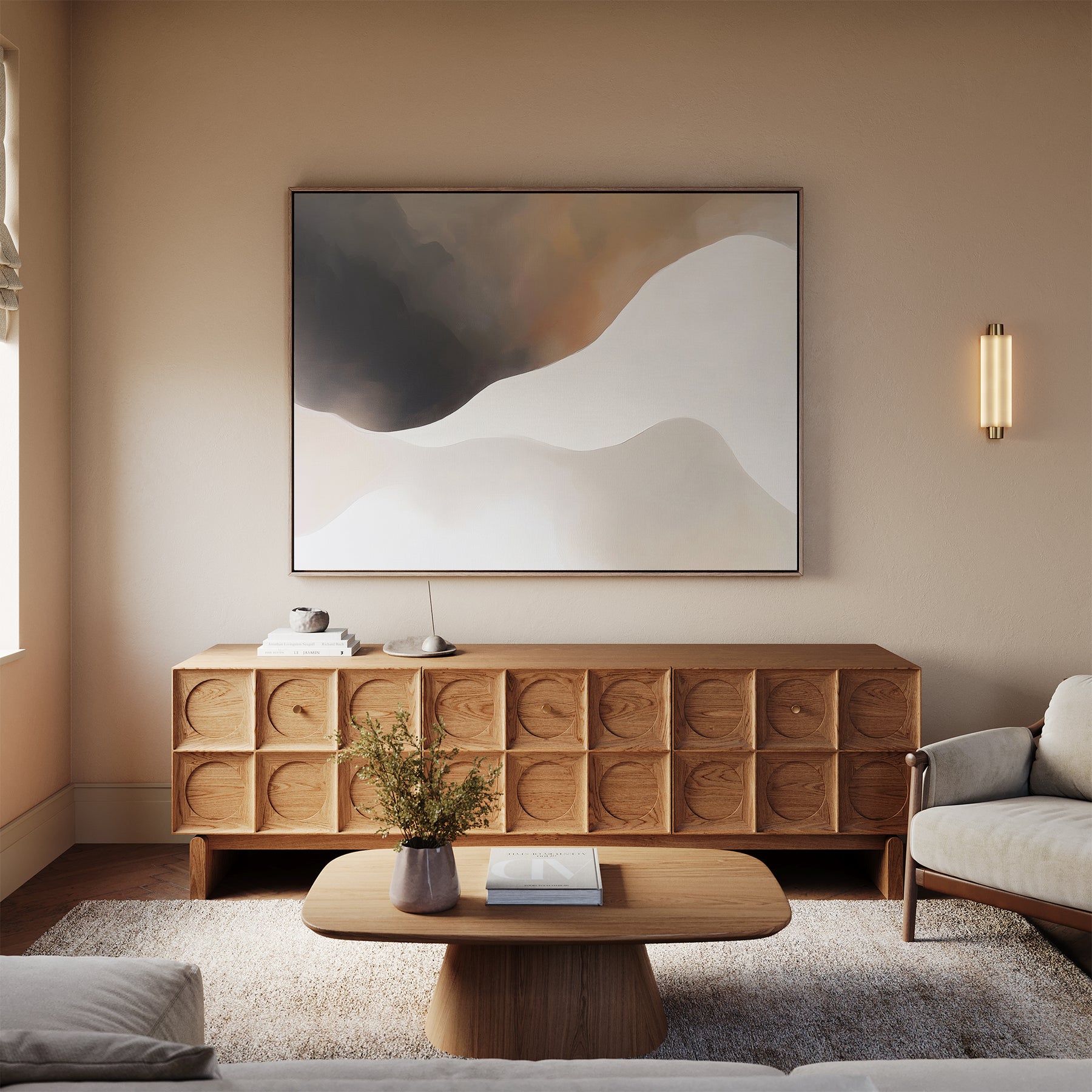 A modern living room with neutral tones features a wooden credenza with textured circles, the Misty Silhouette Canvas Art – Horizontal above it, a rounded coffee table with a book and vase, and a light sofa on a soft rug.