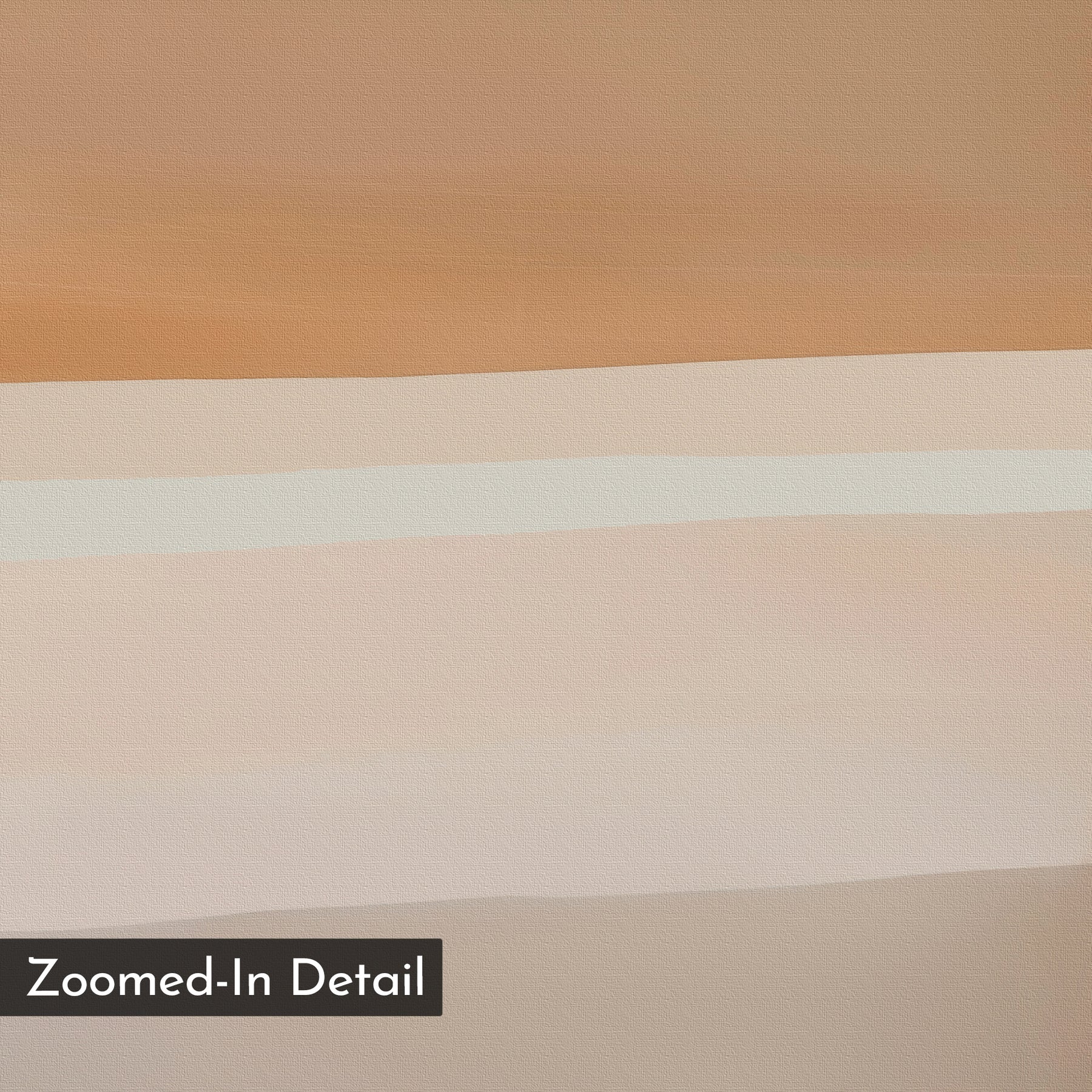Saharan Lines Abstract Canvas Art features horizontal bands in soft earth tones of brown, beige, cream, and pink with a subtle textured surface. Minimalist wall art design includes a black label in the bottom left reading “Zoomed-In Detail.”.