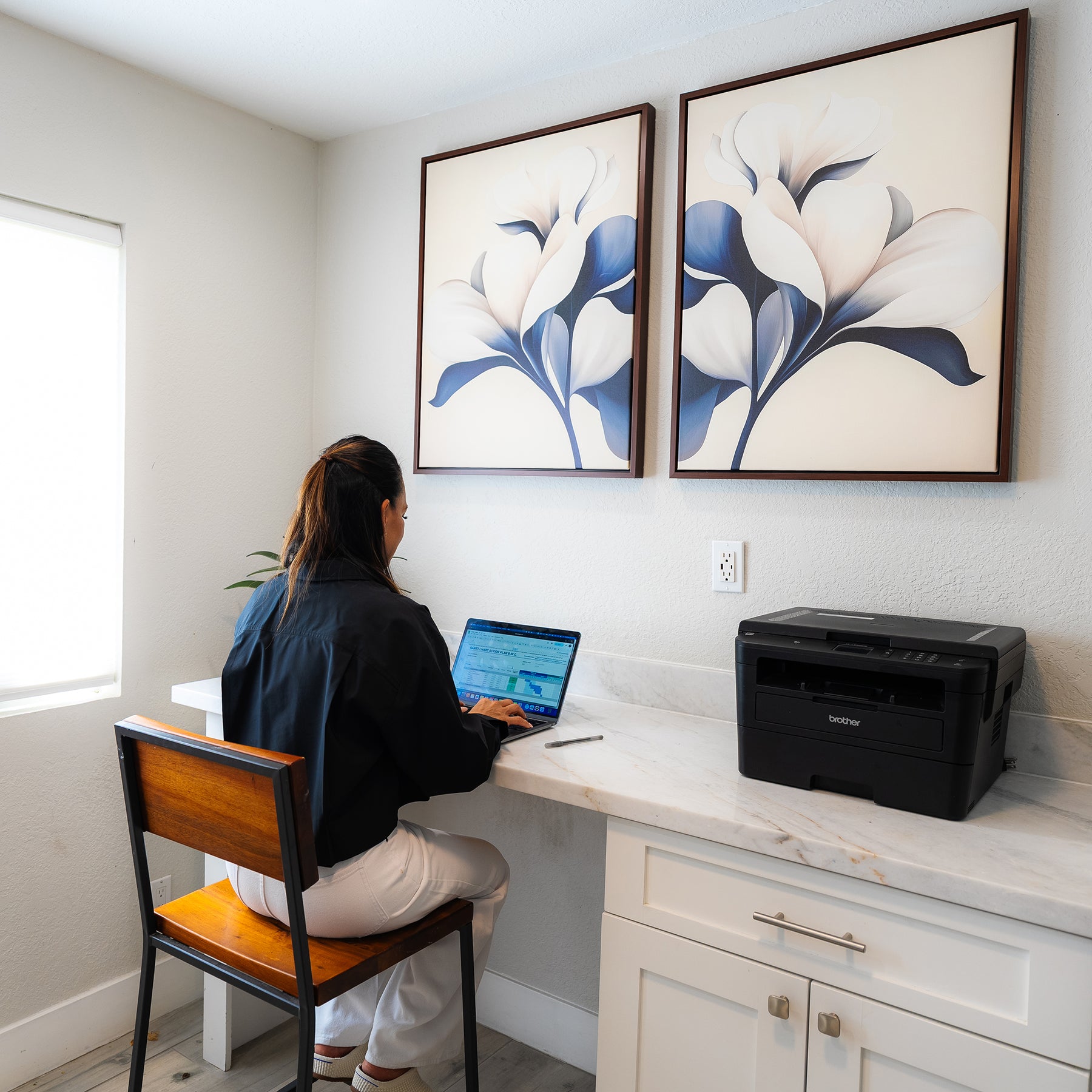 The Navy Magnolia Set of 2 features minimalist framed prints of white magnolia flowers with dark blue and gray leaves, displayed side by side. This floral wall art adds a soft, modern, and elegant touch to any space.