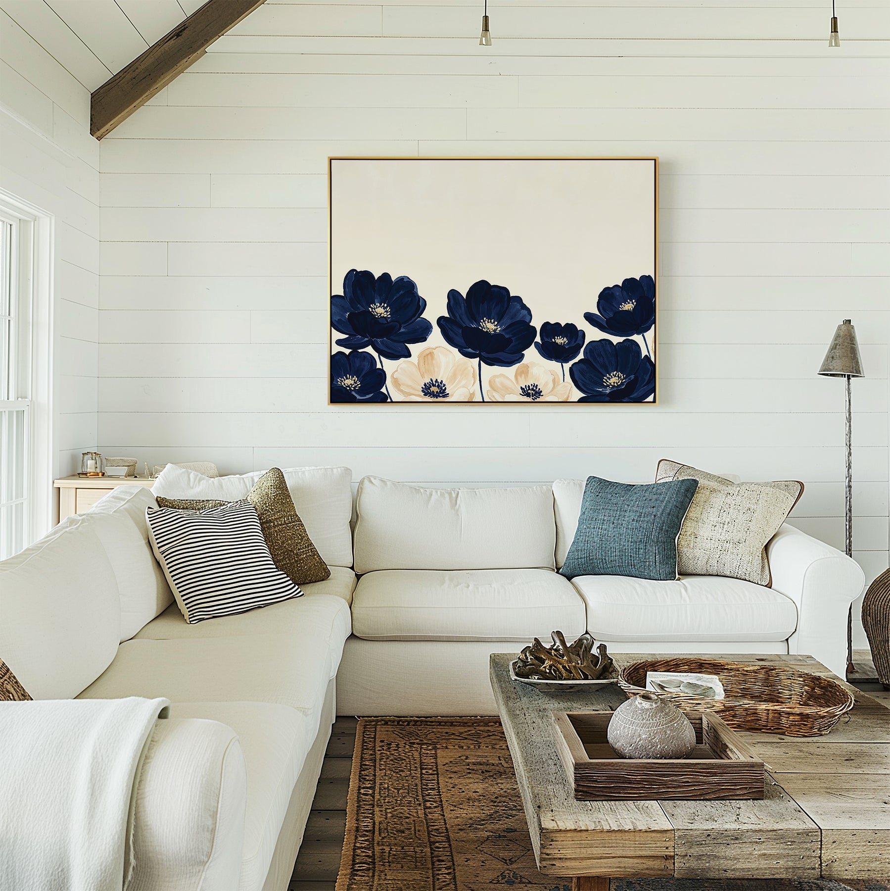 A cozy living room features a white sectional sofa, assorted pillows, a wooden coffee table, and the Nightshade Canvas Art – Horizontal with blue and white floral accents. White shiplap walls and rustic decor complete the inviting space.