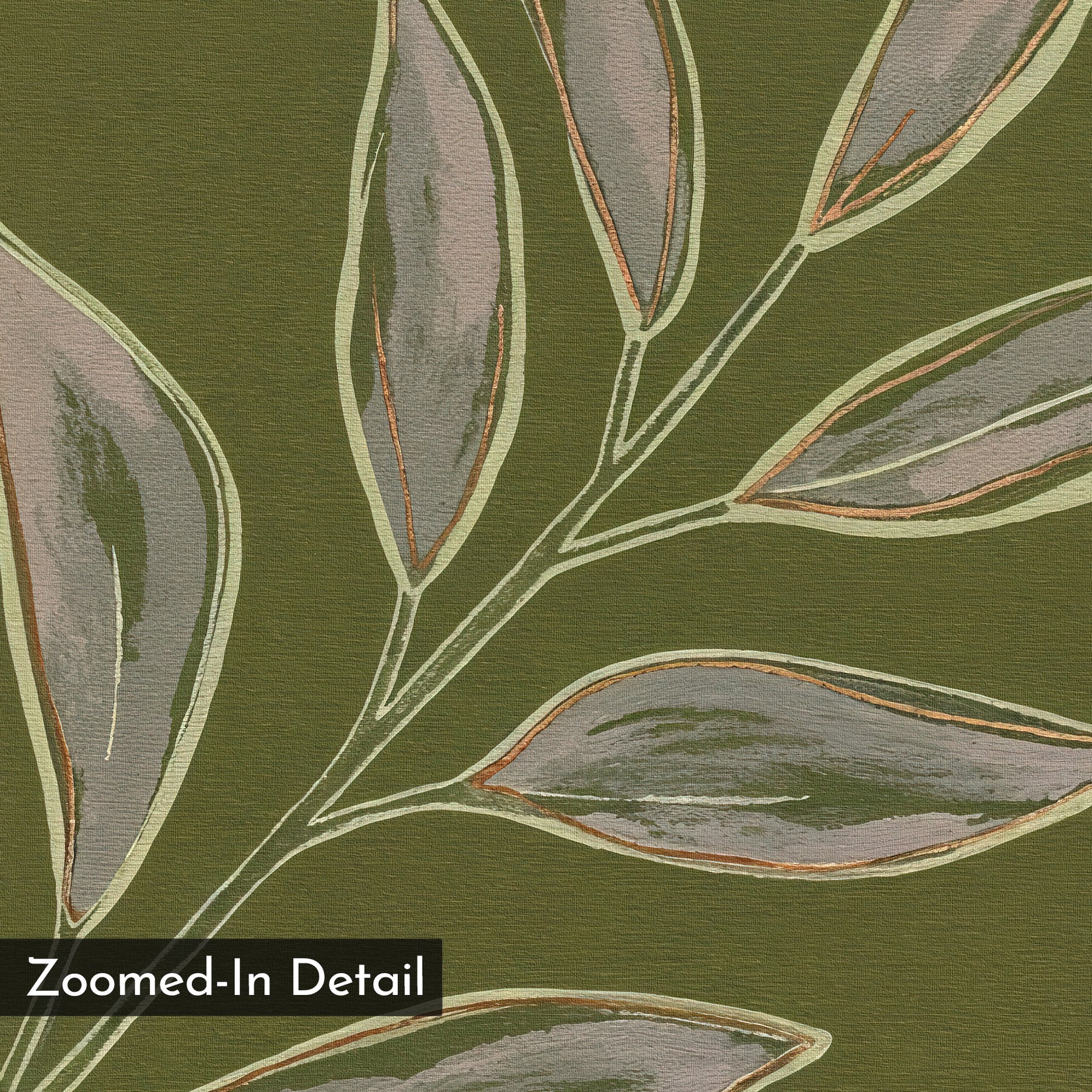 A close-up of illustrated olive branches with elongated green leaves outlined in beige and brown on an olive green background—Olive Branch Canvas Art, ideal botanical wall decor for a modern living room. Lower left corner text reads “Zoomed-In Detail.”.