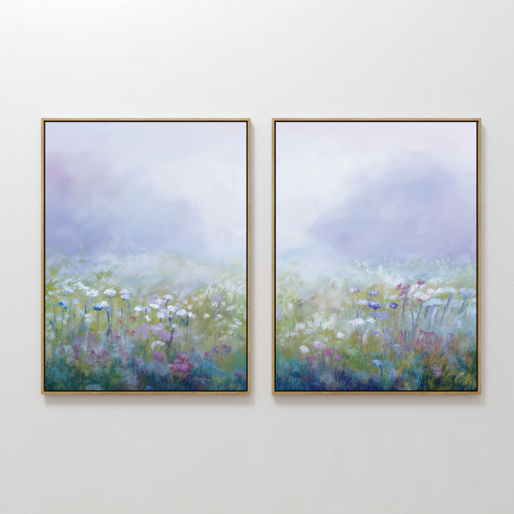 Purple Haze - Set of 2: two framed canvas prints feature a soft, misty landscape with wildflowers in green, purple, and white tones—ideal for bedroom or living room decor. Hang side by side to create a tranquil, dreamy atmosphere.