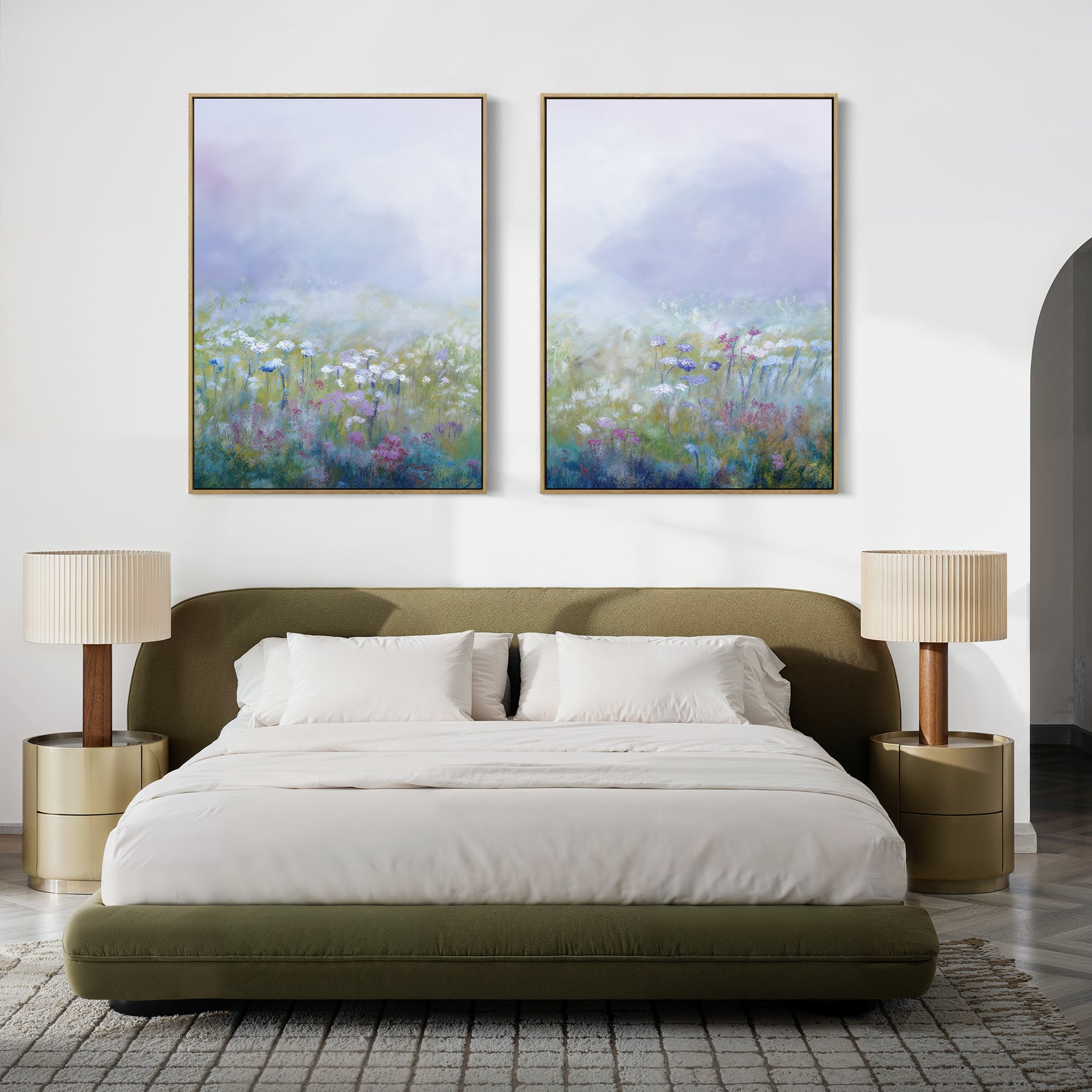 The "Purple Haze - Set of 2" features framed canvas prints of a dreamy meadow with pastel wildflowers in green, purple, blue, and white—ideal for adding a serene vibe to your bedroom or living room décor.