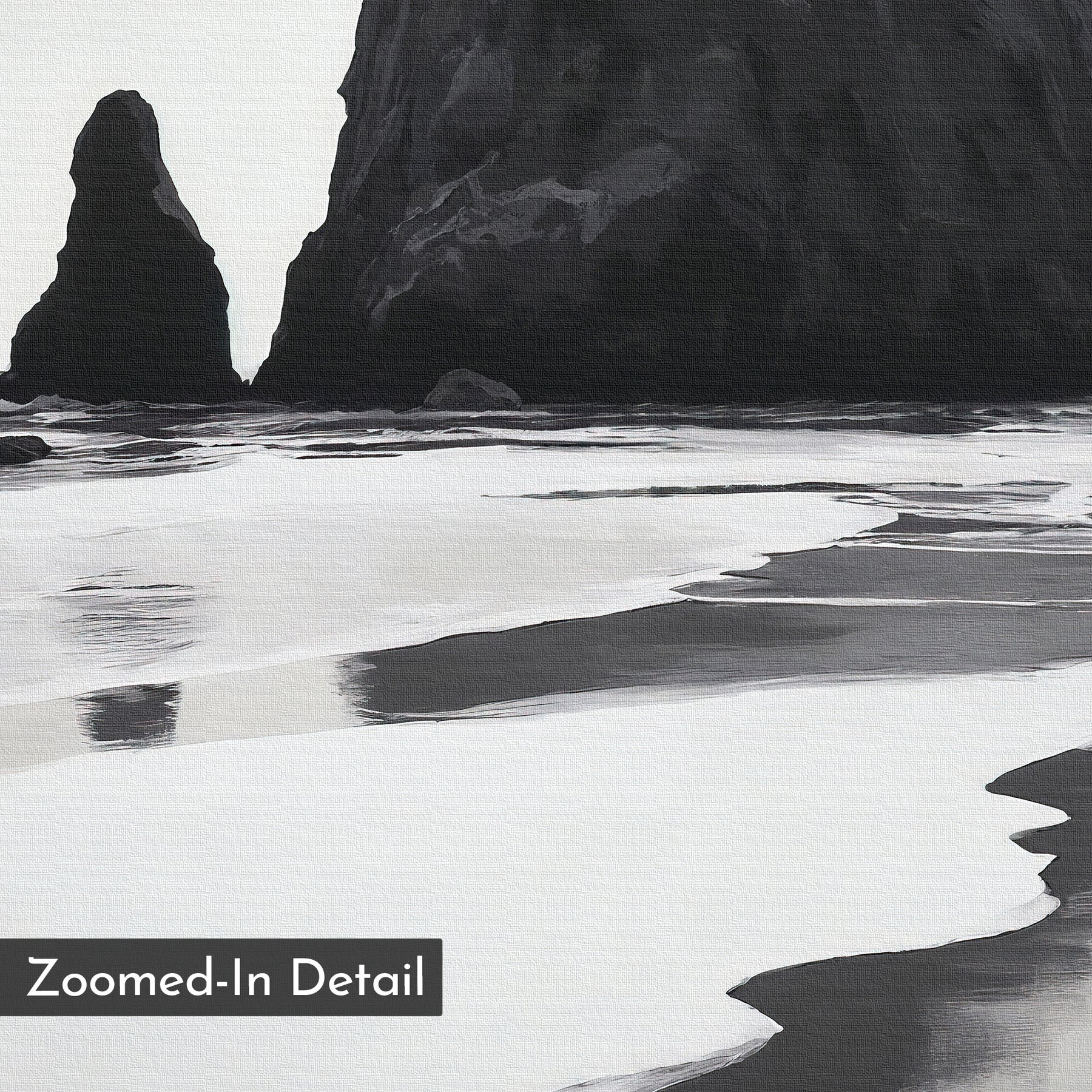 The Basalt Beach Canvas Art depicts striking coastal rock formations and their reflections on wet sand in black and white, ideal for minimalist coastal decor. A “Zoomed-In Detail” label appears at the bottom left.