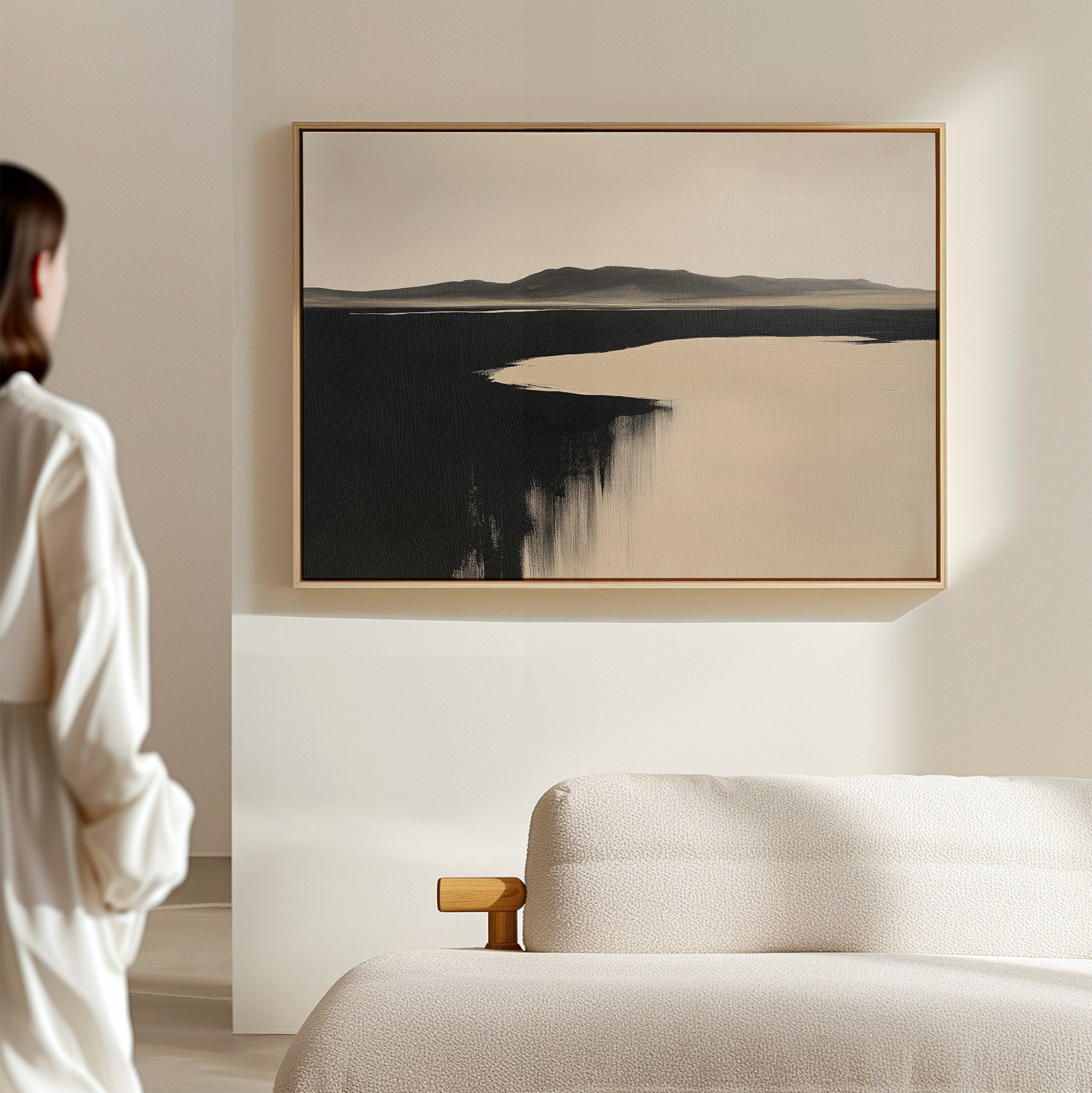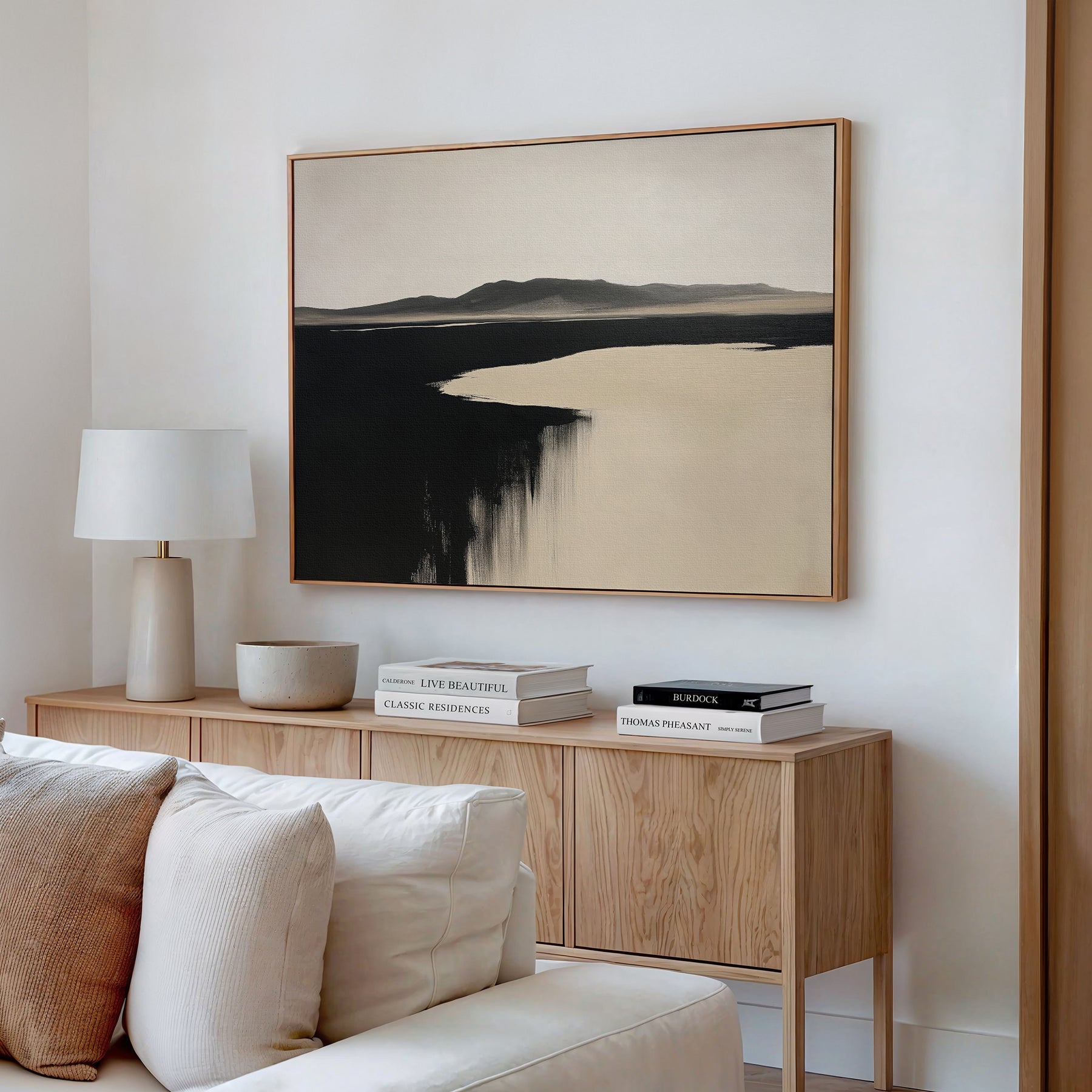 The Black Shore Canvas Art – Horizontal features minimalist wall art with soft beige and black tones, a calm water body, dark mountains, and an abstract serene vibe in a black frame—ideal for modern living room decor.