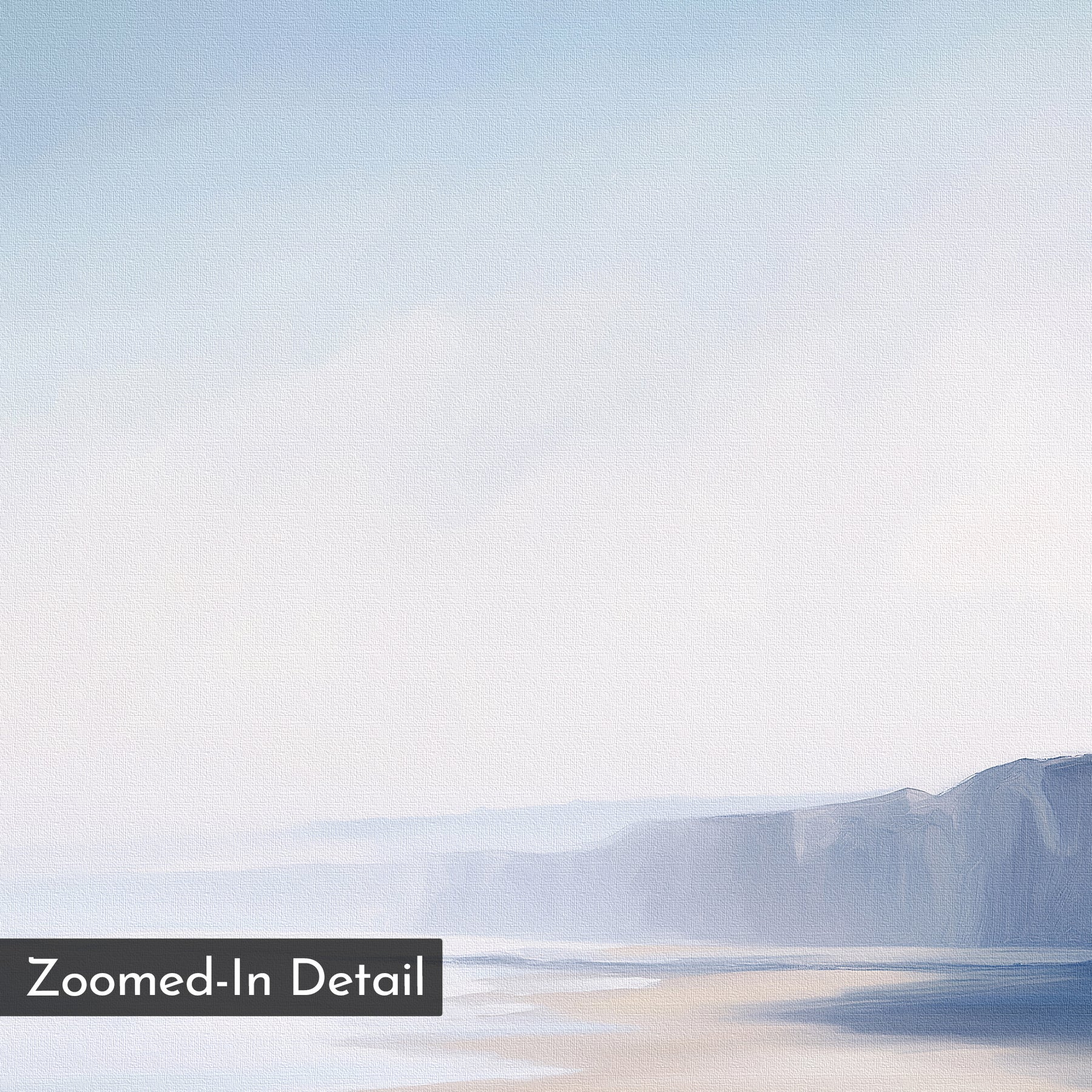 Cliffside Light Canvas Art: A soft, pastel painting of misty cliffs and a sandy shore—perfect minimalist wall decor. "Zoomed-In Detail" is shown in a black box at the lower left corner.