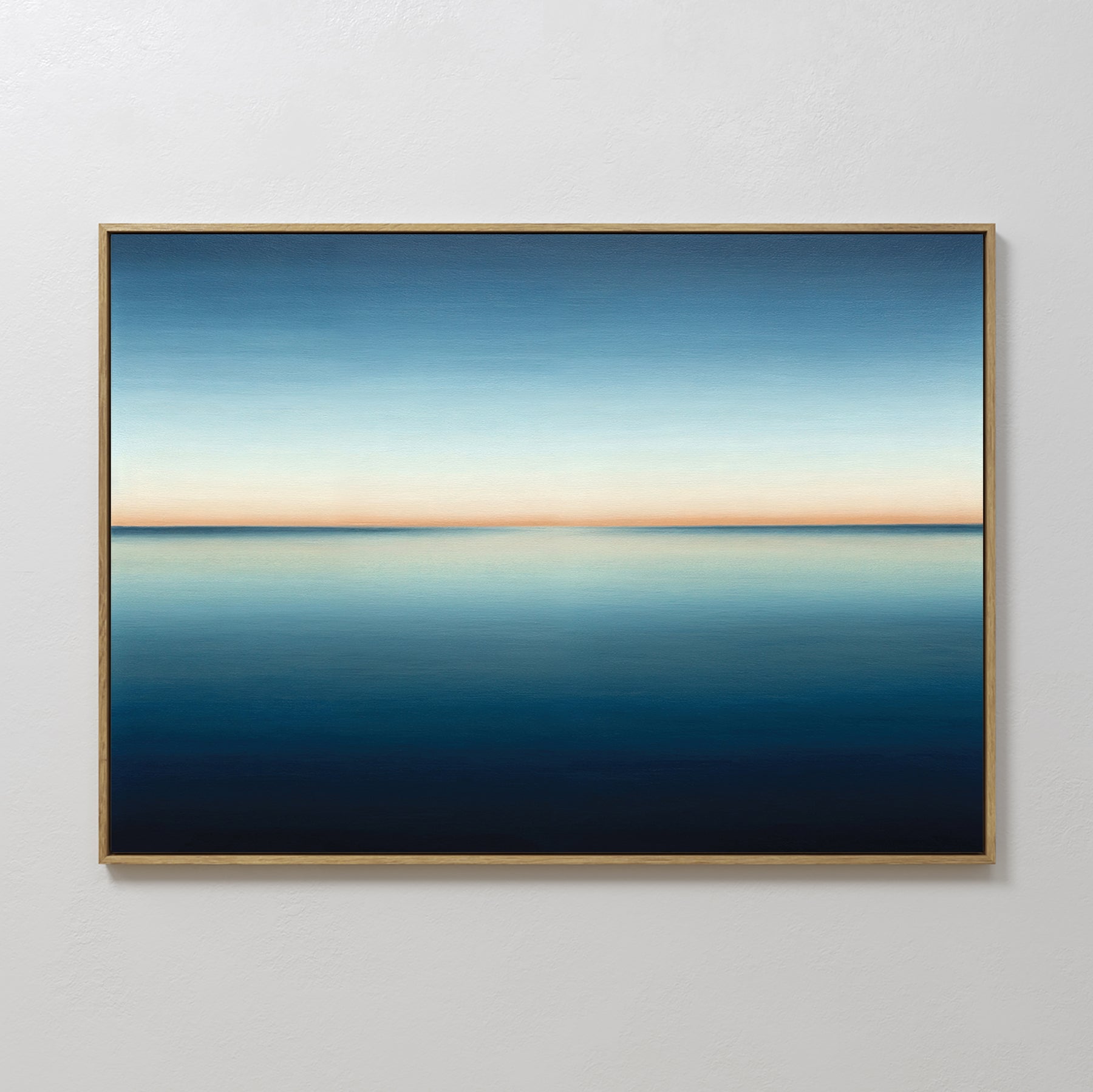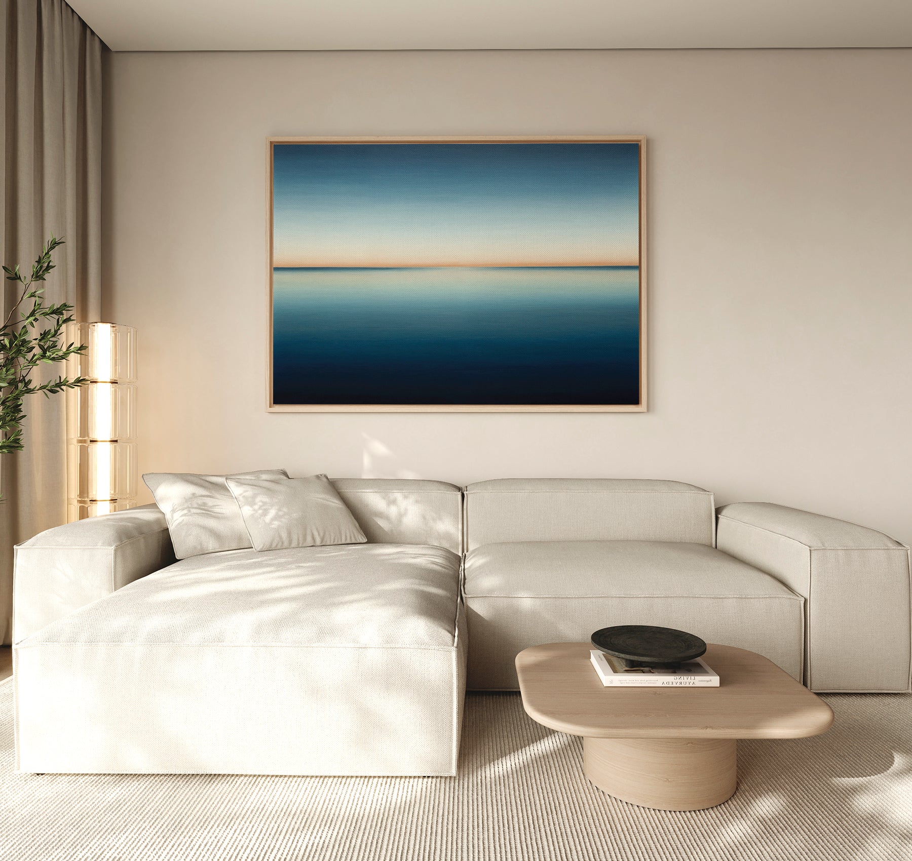 The Indigo Passage Canvas Art – Horizontal features a tranquil, minimalist horizon over calm water with a gradient sky, ideal for modern living room decor and adding serene elegance to your space.