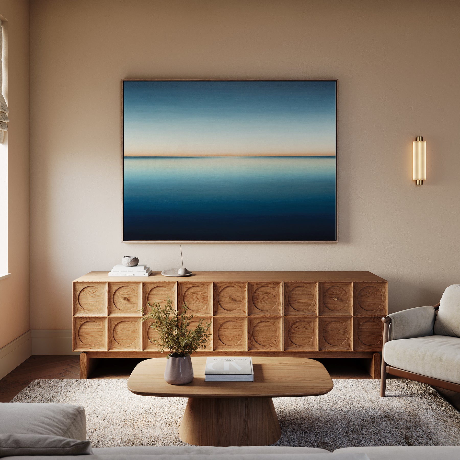 A modern living room with a wooden sideboard, white lamp, books, a bowl, and a beige sofa features the Indigo Passage Canvas Art – Horizontal above the sideboard, lending a minimalist and serene touch to the space.