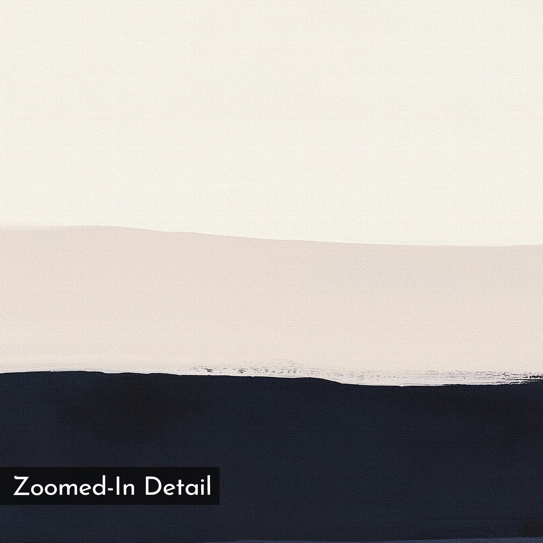 Ivory Dusk Canvas Art – Horizontal features three layers: a large white upper section, slim beige middle band, and bold dark navy base. "Zoomed-In Detail" appears in the lower left. Perfect minimalist wall art for modern spaces.