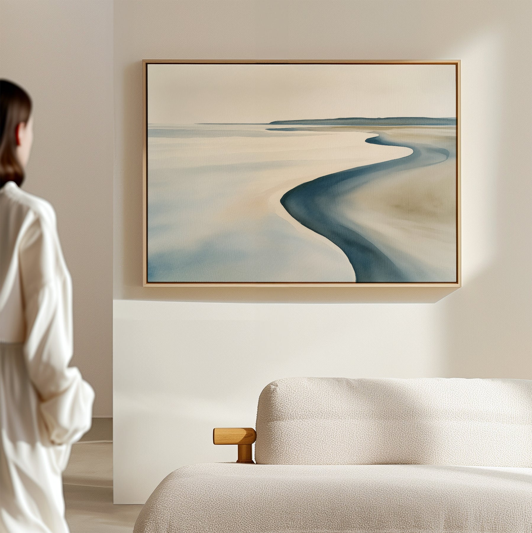 A woman admires the Serene Coastline Canvas Art – Horizontal, a framed abstract landscape in soft blue and beige tones, displayed above a light sofa in a minimalist room, enhancing the modern home decor.