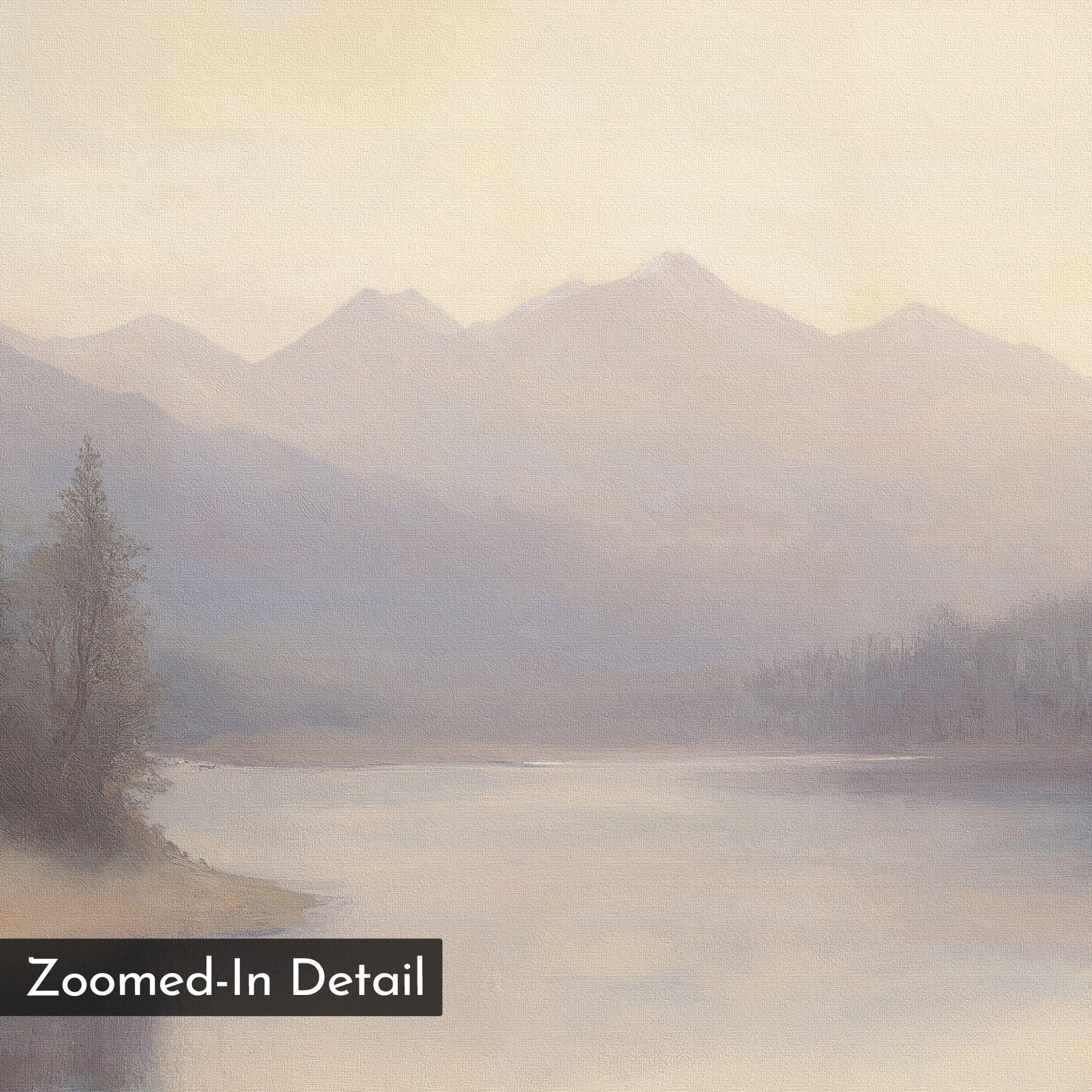 Smoky Peaks Canvas Art features a soft, pastel landscape of calm water reflecting distant mountains and trees under a hazy sky, adding a serene touch to any space—ideal for vintage decor or as an elegant print canvas.