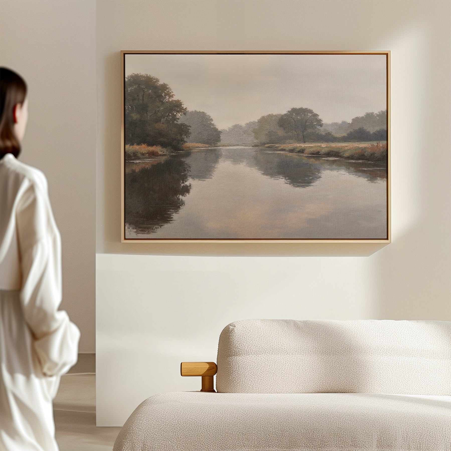 The Still Riverbank Canvas Art – Horizontal features a calm river reflecting trees and an overcast sky in soft, muted colors, ideal as minimalist wall art for serene bedroom decor. Displayed mounted on a white wall.