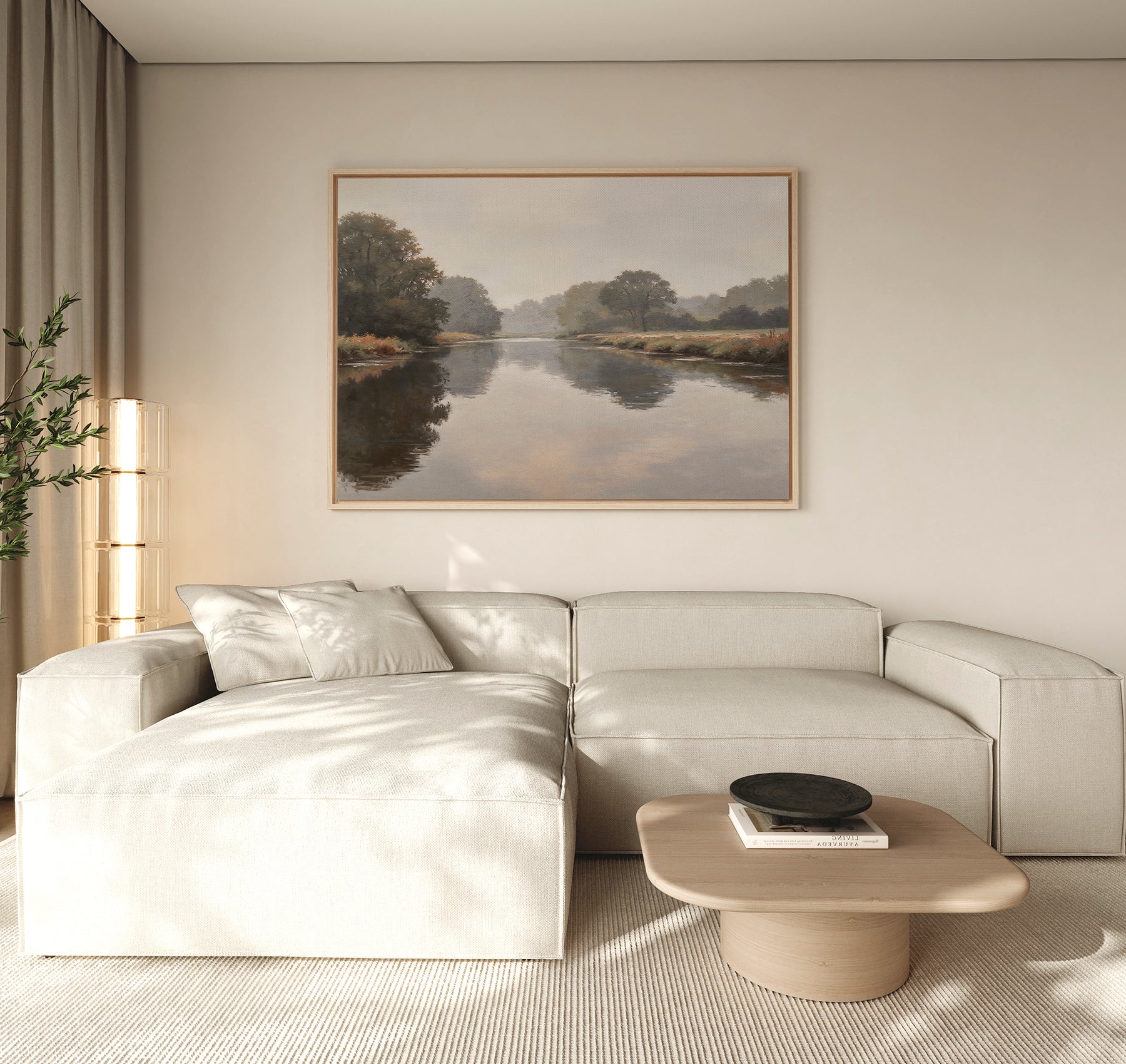 A modern living room with a light beige sectional, wooden coffee table with black bowl, and the Still Riverbank Canvas Art – Horizontal on a neutral wall. Natural light brightens the space.