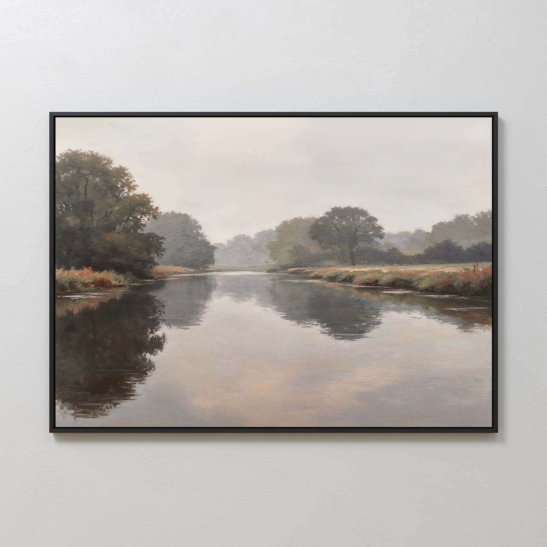 Still Riverbank Canvas Art – Horizontal features a calm river reflecting trees and shrubs beneath a hazy sky in soft, muted tones—ideal minimalist wall art to bring peaceful, tranquil style to your bedroom decor.