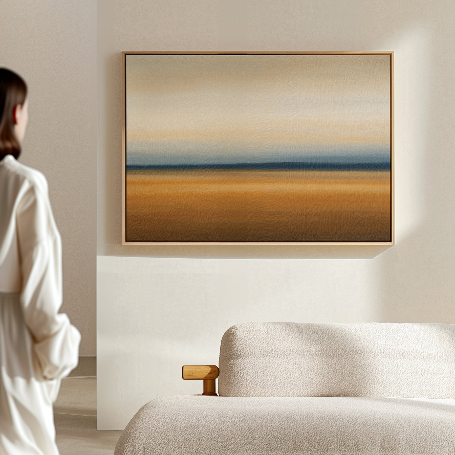 Enhance your space with 'Caramel Plains- Horizontal' by Nordic Park, a warm abstract wall art print in rich caramel, beige, and soft blue tones. This minimalist piece brings a sense of calm and depth, perfect for modern bedroom or living room decor