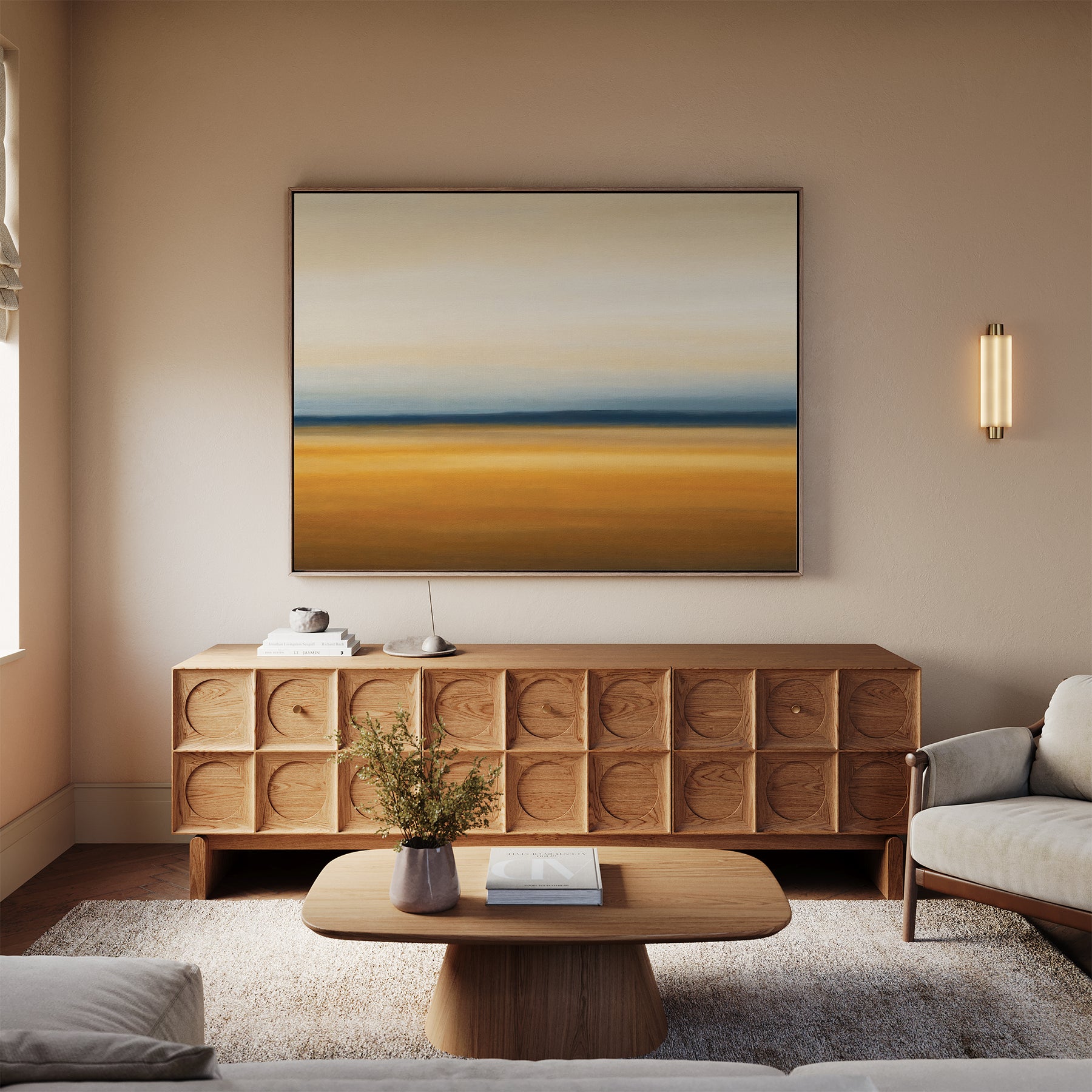 A modern living room with a beige sofa, wooden coffee table, and geometric wooden sideboard. Above the sideboard hangs the Caramel Plains Canvas Art – Horizontal. A soft rug and small plants complete this inviting setting.
