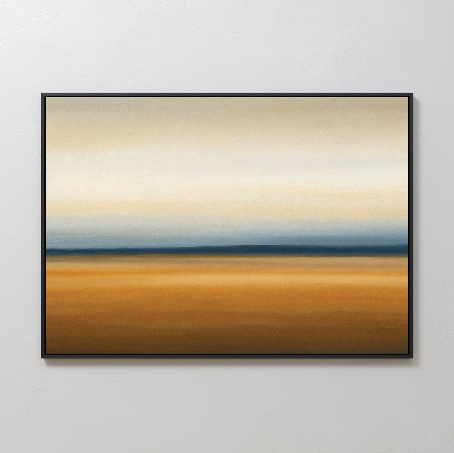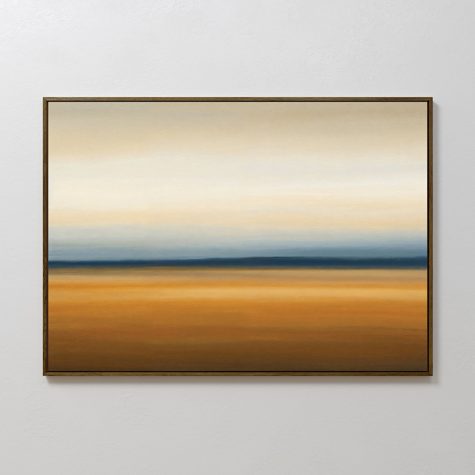 Caramel Plains Canvas Art – Horizontal features minimalist bands of warm golden brown blending into soft blue, beige, and off-white—perfect abstract wall art to evoke a serene horizon in modern bedroom decor.