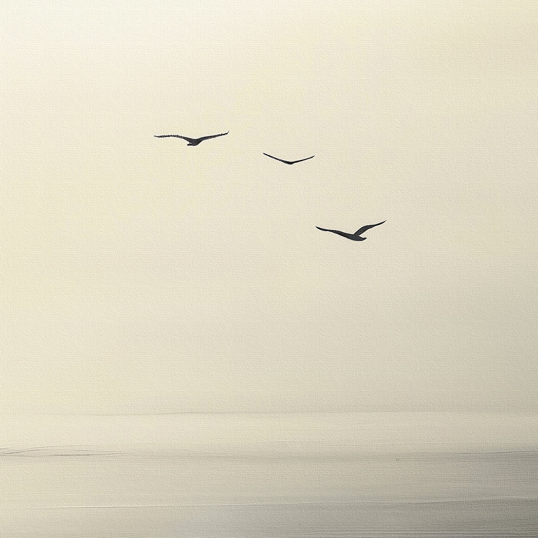 A tranquil moment in flight—Above the Calm Canvas Art by Nordic Park features a trio of birds gliding above a muted shoreline. Soft gradients of ivory, beige haze, and charcoal black create a peaceful contrast, evoking early morning stillness. A minimalist wall art print perfect for large living room decor, bedroom decor, or calm modern spaces.