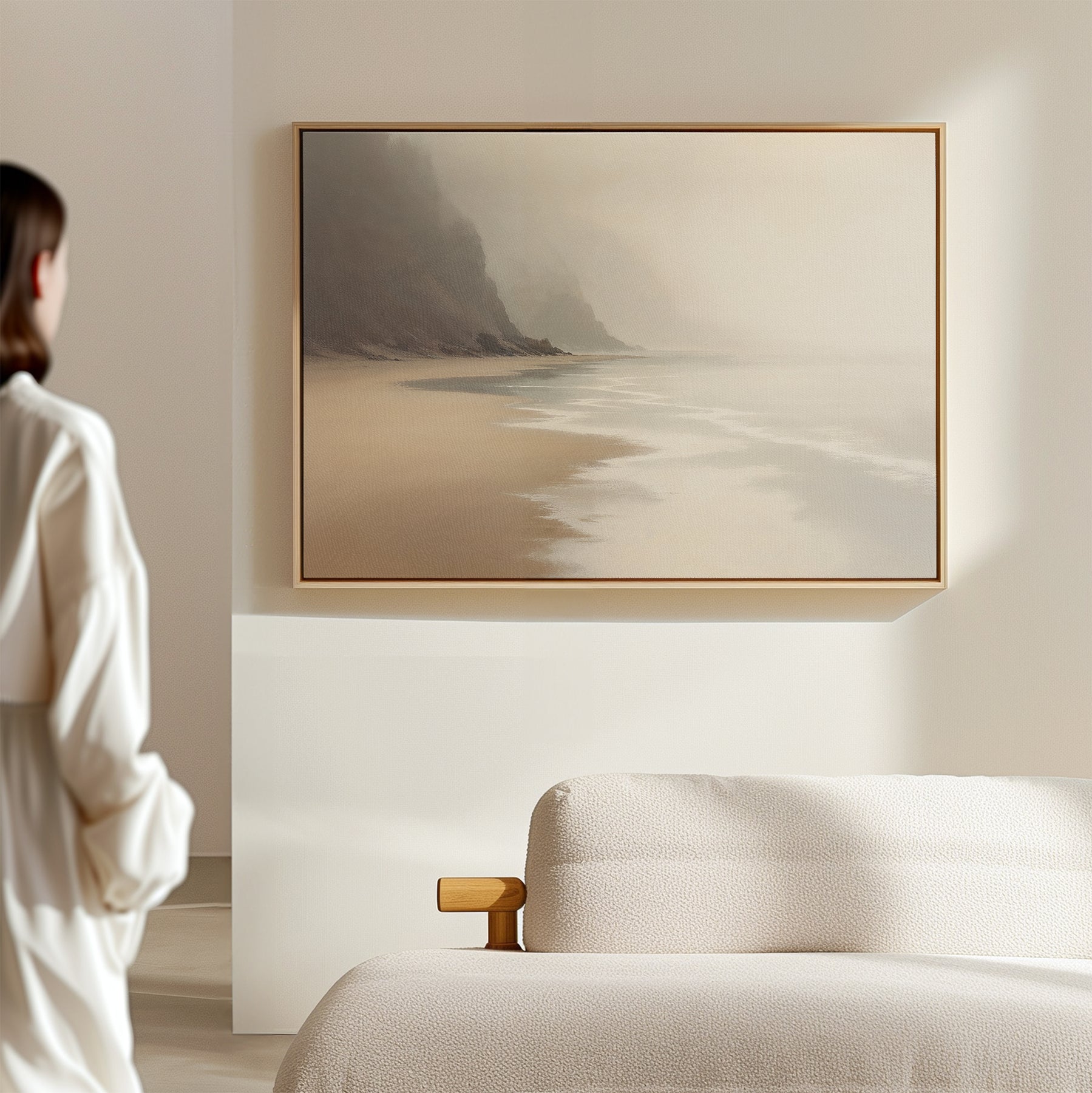 A person in white stands in a minimalist room, gazing at the Coastal Silence Canvas Art - Horizontal featuring a misty beach with waves and cliffs, above a light-colored sofa, evoking muted coastal decor.