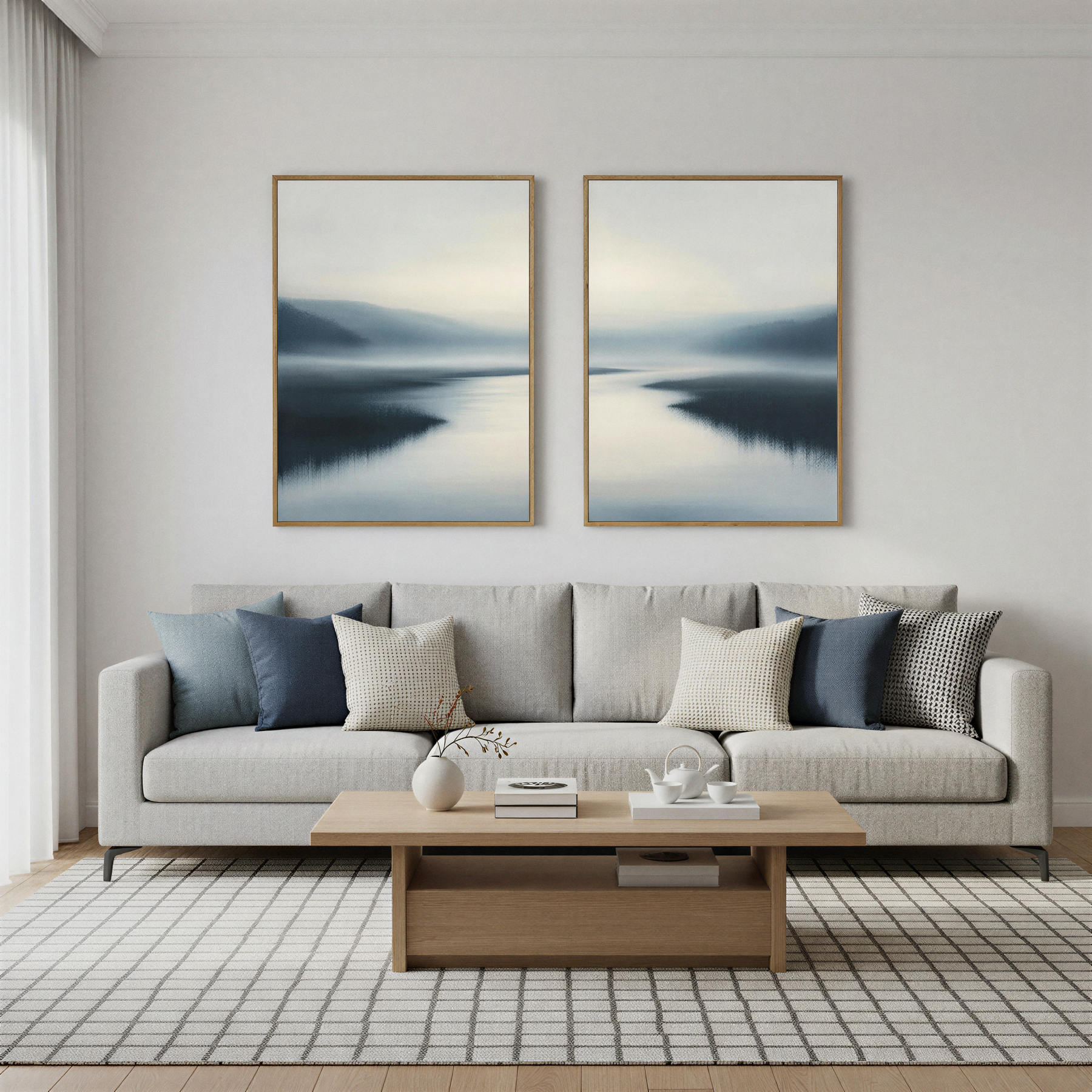 A modern living room with a light gray sofa, blue and beige pillows, a wooden coffee table, and the "Peaceful Waters Set of 2" calming landscape wall art of misty mountains and water hanging above the sofa on a white wall.