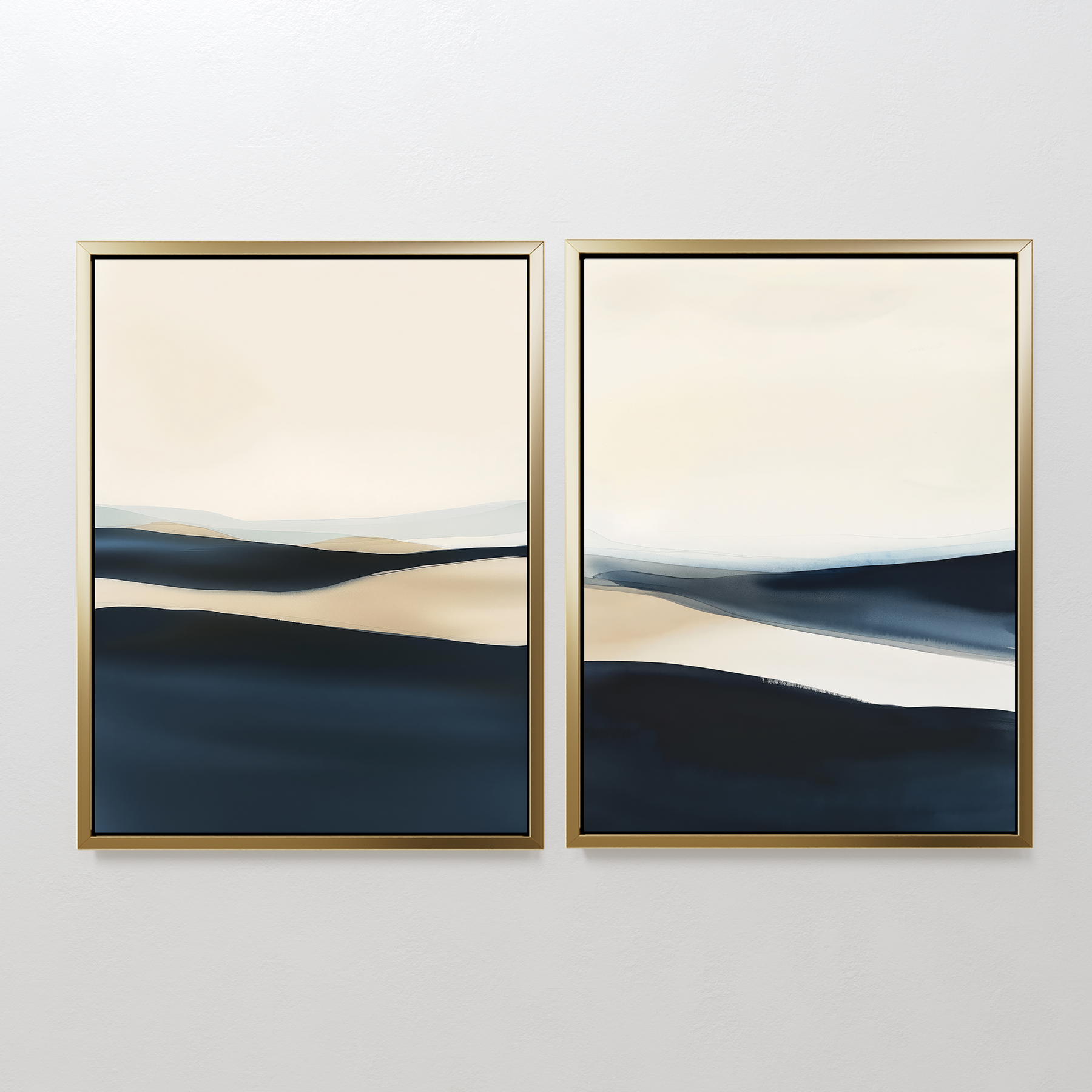 The Twilight Horizons Set of 2 features abstract landscape paintings with gold frames and soft beige, navy, and dark blue shapes—modern wall art that brings a serene horizon feel to any space.