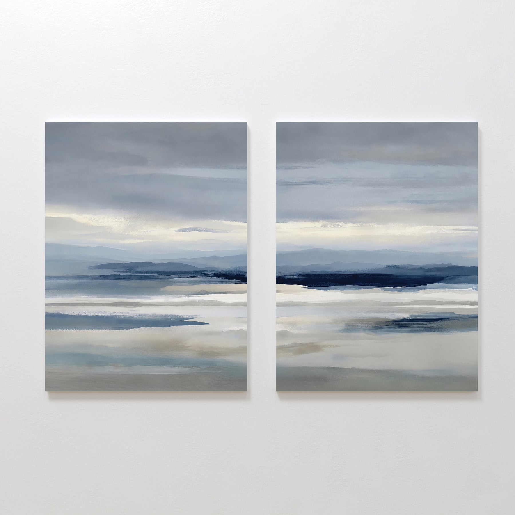 The Blue Mist Horizon Set of 2 features abstract landscape prints in soft blue, gray, and beige. These large canvases create a serene seascape, perfect as minimalist wall art for your living room, displayed side by side on a white wall.