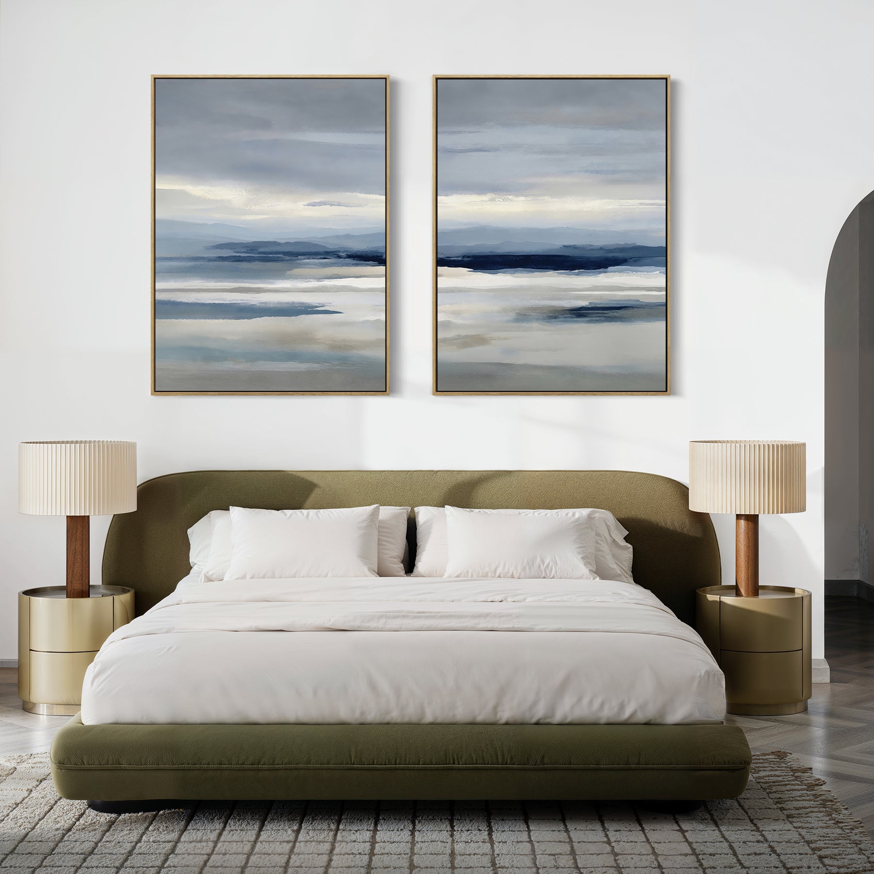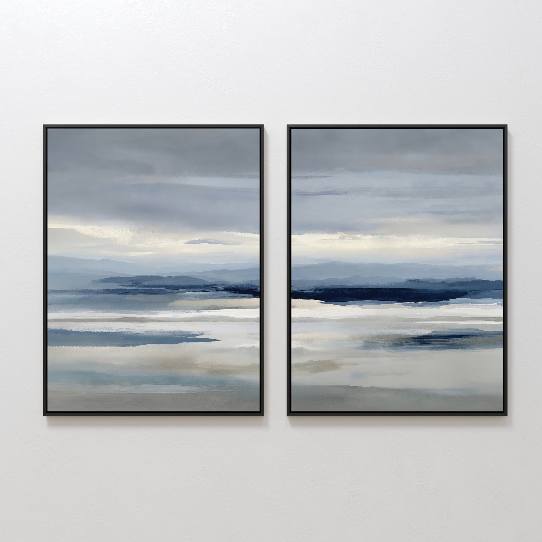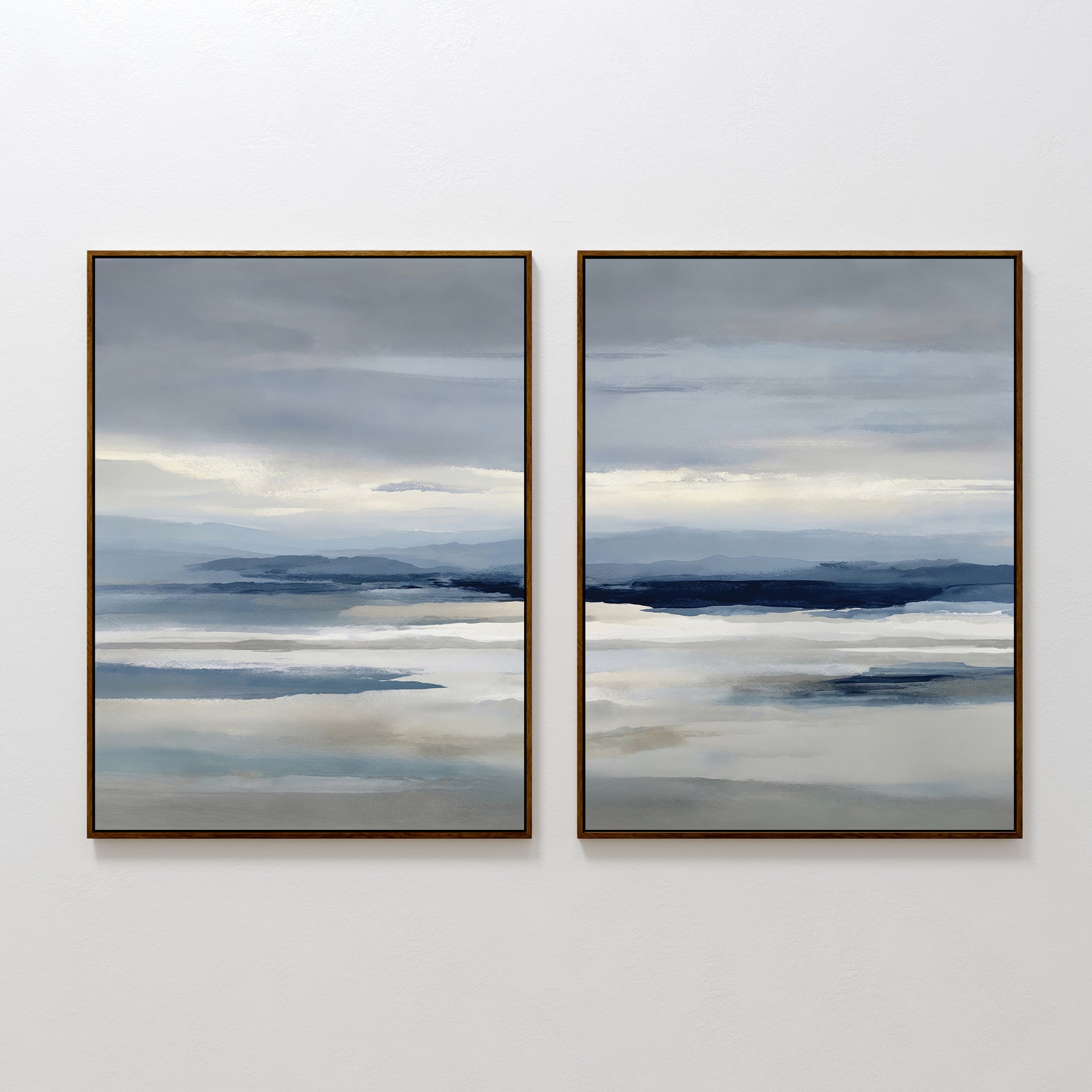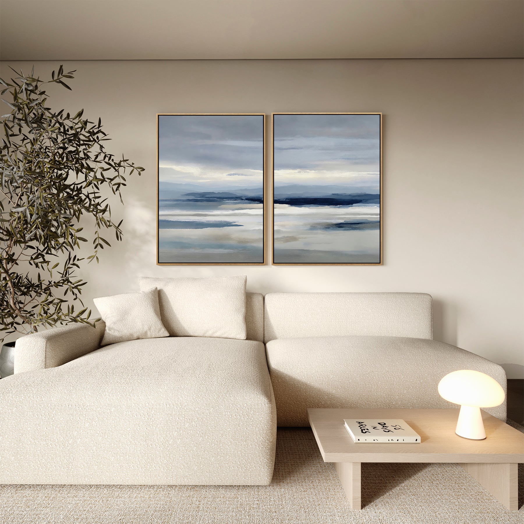 The Blue Mist Horizon Set of 2 features large abstract landscape prints in soft blue, grey, and beige. These framed canvases evoke a serene, cloudy sky, adding calming, minimalist decor to your living room when hung side by side.