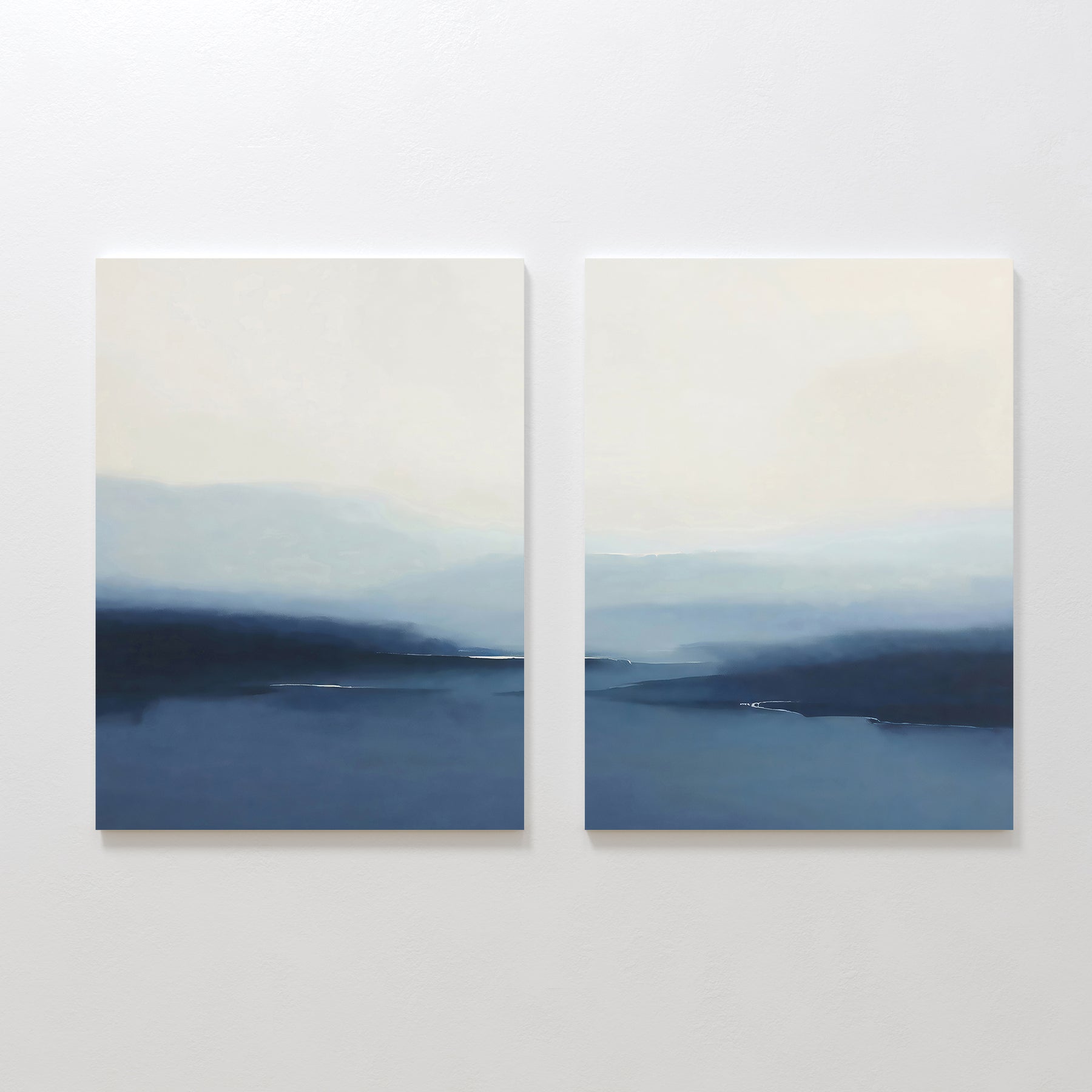 The Blue Valley Mist Set of 2 features square abstract prints with misty blue and white landscapes, soft lines evoking distant mountains and water under a pale sky—ideal minimalist wall art for any space.