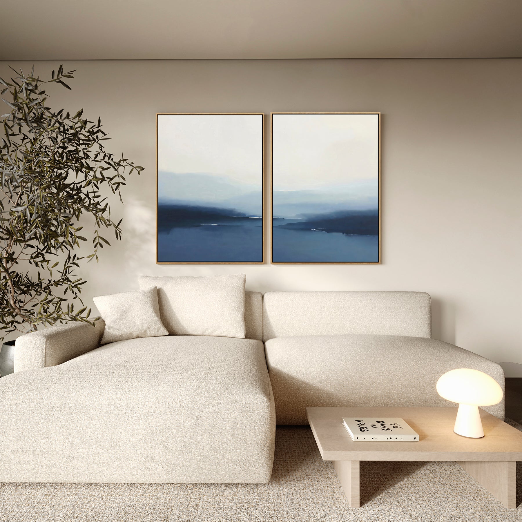 A modern living room with a cream sectional, small wood coffee table with lamp and book, minimalist decor, and the Blue Valley Mist Set of 2 wall art prints above the sofa. A tall plant stands in the corner.