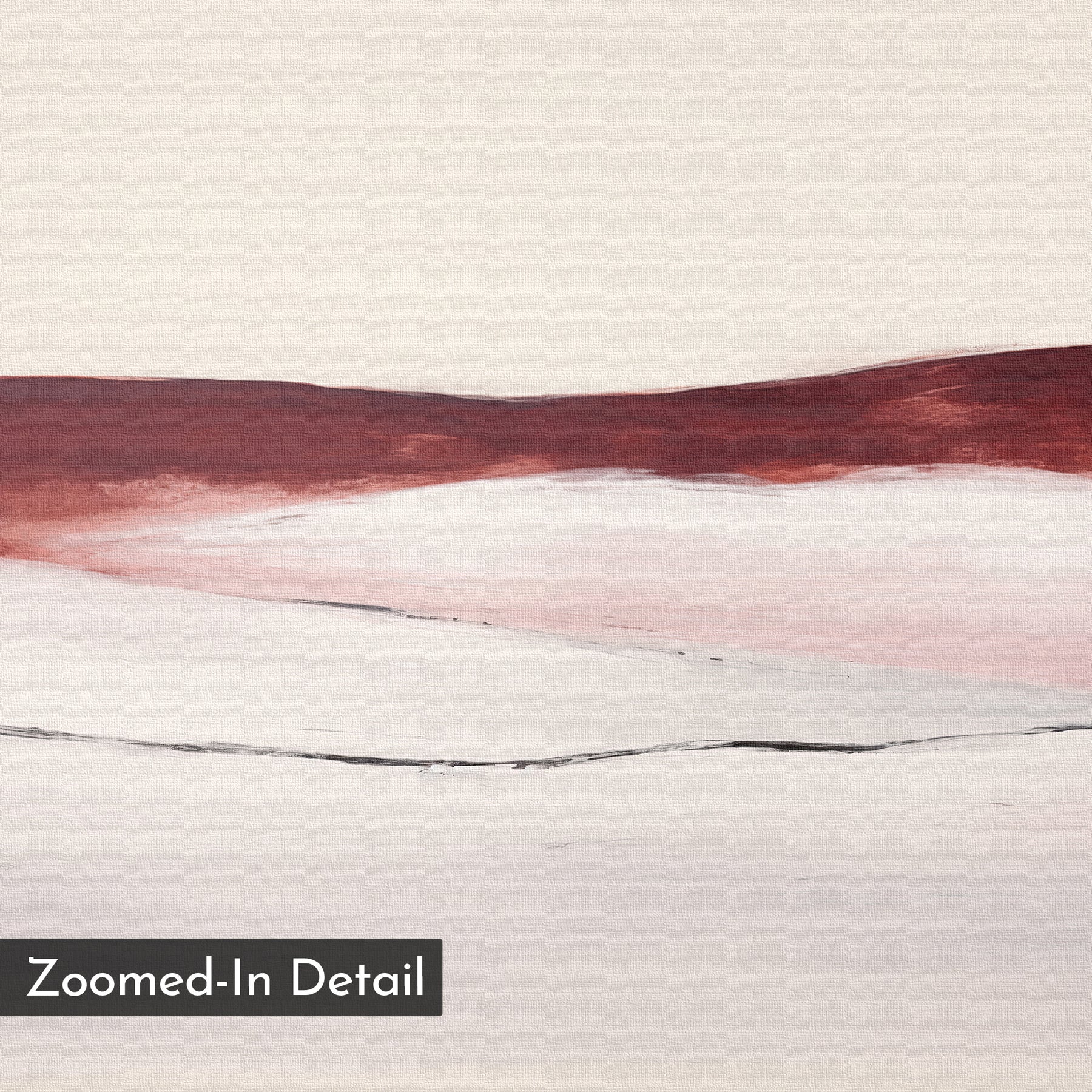 Crimson Horizon Abstract Canvas Art features soft, flowing layers of white, pink, and deep red with a thin black horizontal line. Minimalist wall decor ideal for the living room. “Zoomed-In Detail” appears in the bottom left corner.
