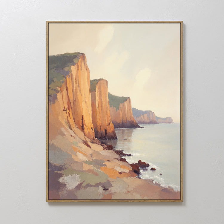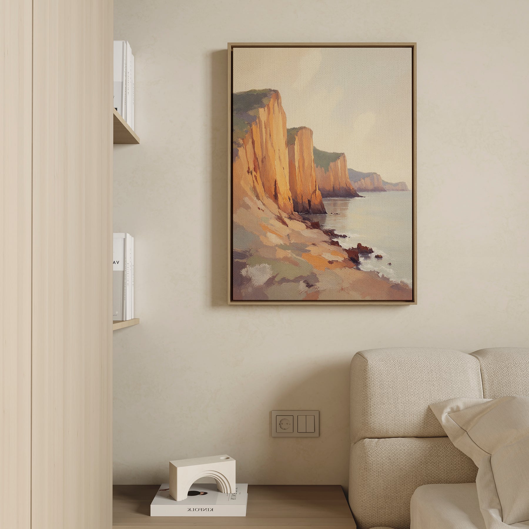 Coastal Grandeur captures the majestic beauty of towering seaside cliffs in warm golden and orange tones against a soft, muted sky. This canvas print by Nordic Park showcases dramatic rock formations meeting gentle waves, with earthy beiges and subtle blues creating a serene coastal atmosphere. Perfect for living rooms or bedrooms seeking natural elegance.