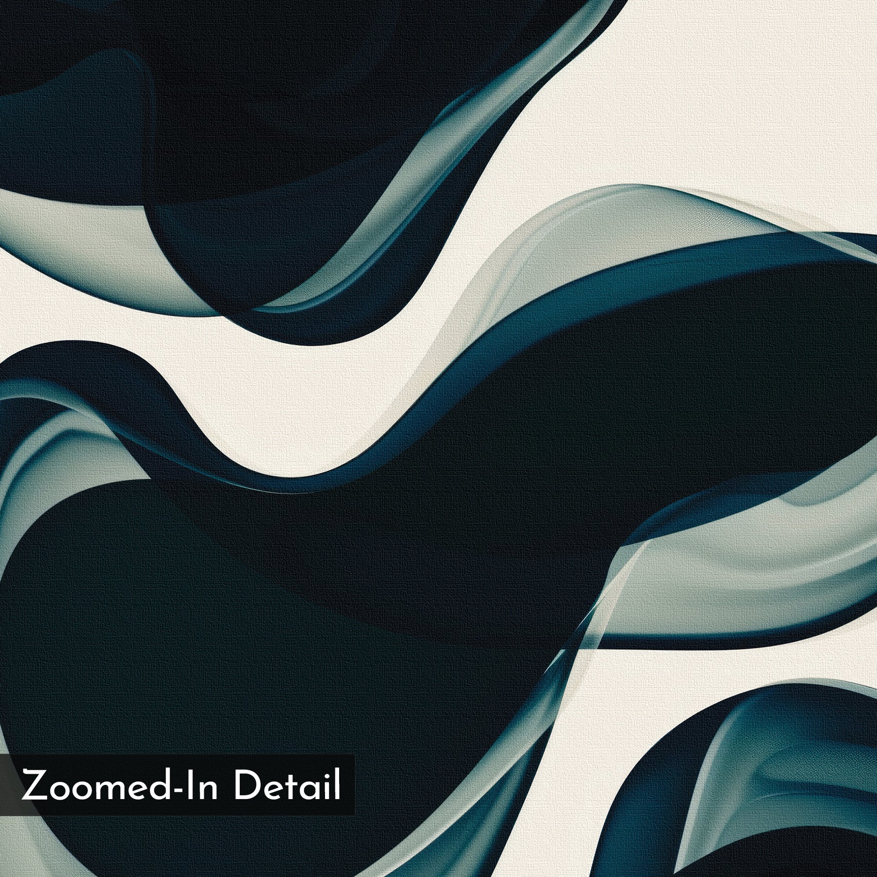 Deep Sea Hues Abstract Canvas Art showcases flowing, semi-transparent dark blue and black waves on a light background, evoking ocean depth. Perfect minimalist wall art for your living room. Features “Zoomed-In Detail” text in the bottom left corner.