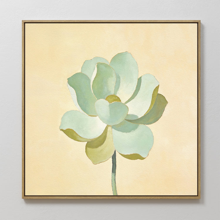 The Jade Reflection Canvas Art - Square showcases a light green succulent with soft petals on a pale beige background, framed in slim dark wood and displayed on a white wall for a minimalist look.