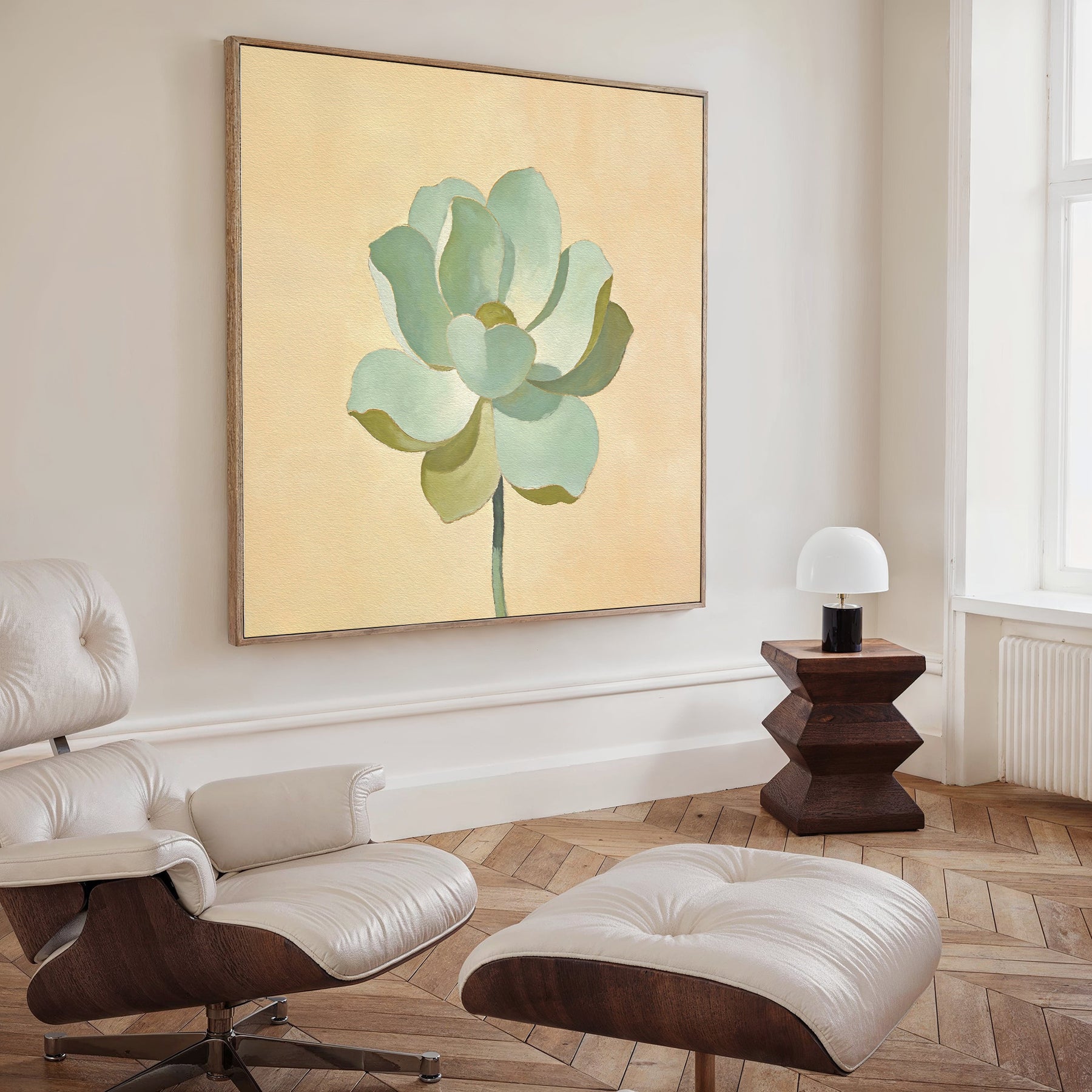 A modern living room with a cream lounge chair and ottoman, a wooden side table with a white lamp, and the Jade Reflection Canvas Art - Square featuring a green flower on beige in a Nordic-inspired minimalist style.