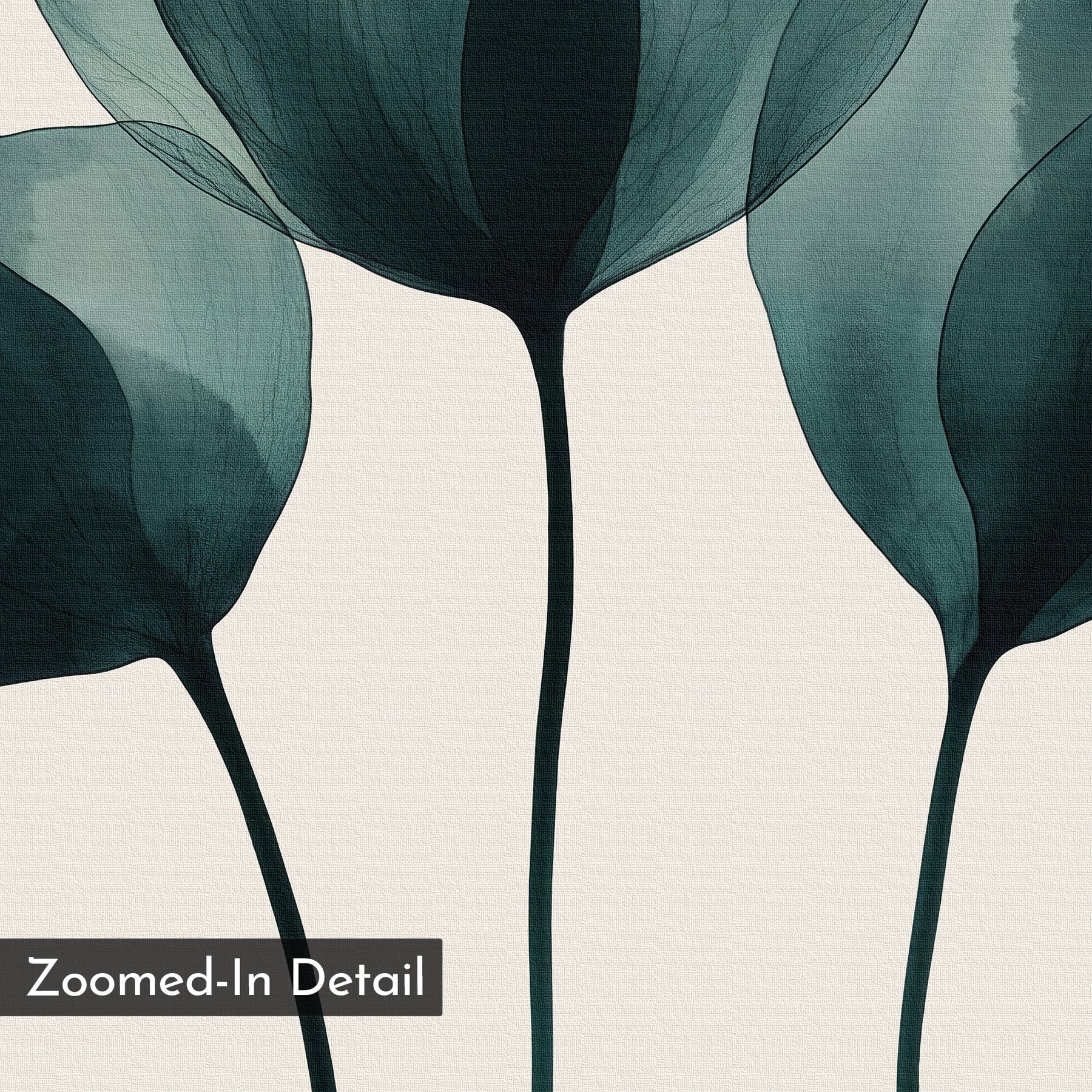 Leafy Balance Canvas Art showcases a zoomed-in detail of three abstract teal leaves with dark stems on a light background, ideal for living room decor or as part of a canvas set.