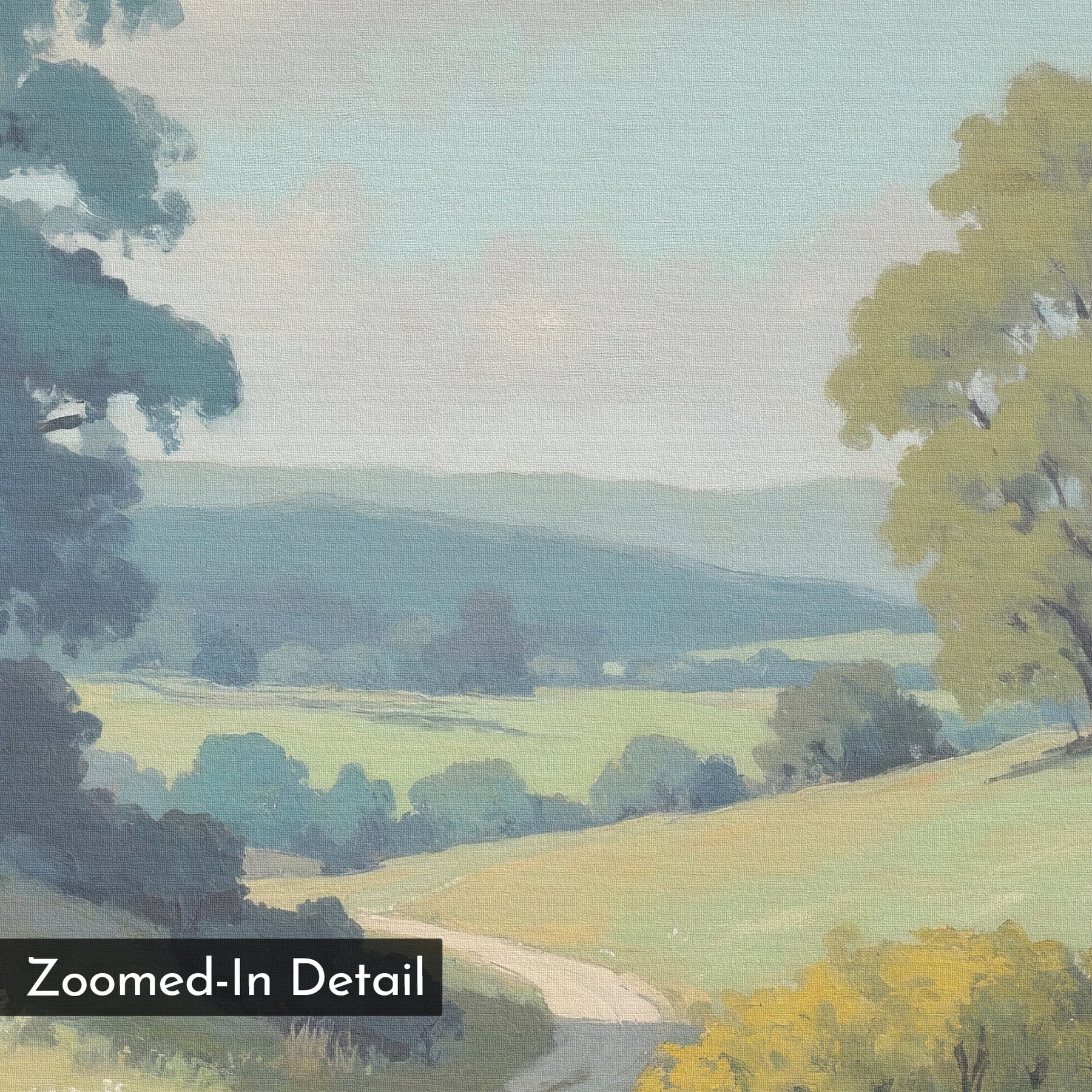 A zoomed-in detail of the Summer Dale Canvas Art shows a curved path through green fields with trees, distant blue hills, and a partly cloudy sky. “Zoomed-In Detail” appears in the lower left corner.
