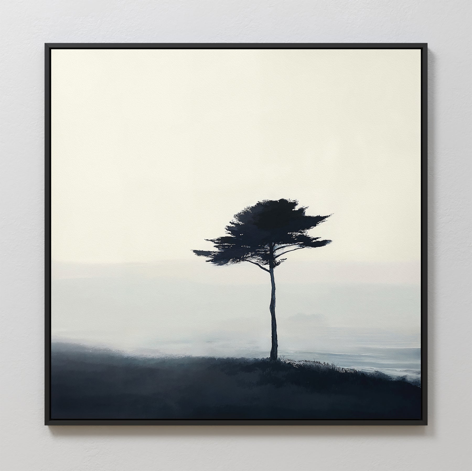 Windswept Solitude Canvas Art - Square features a minimalist painting of a lone tree on a misty hill with sparse foliage, set against a pale background and framed in black—ideal modern wall art for your living room decor.