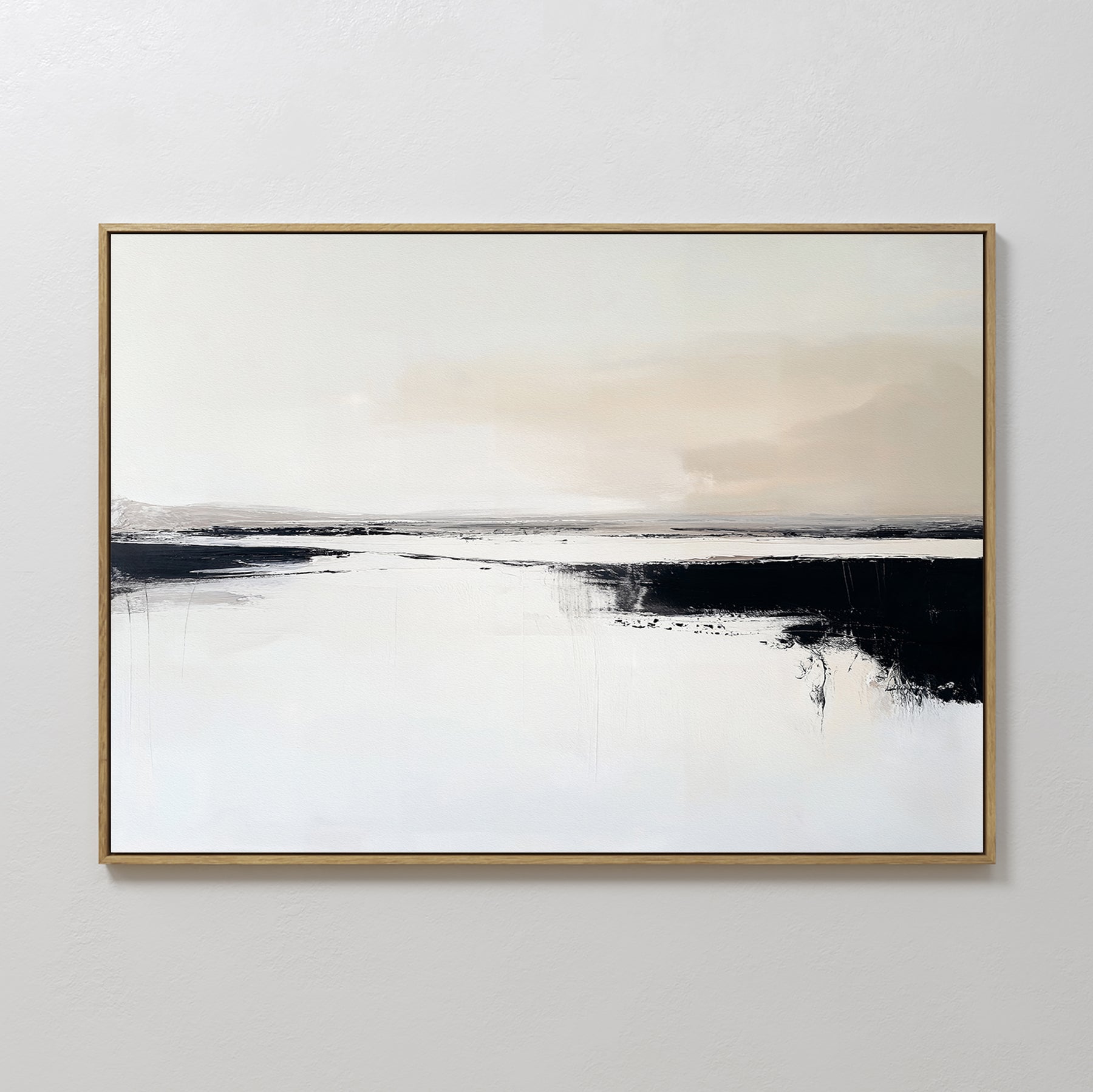 Binary Calm Abstract Canvas Art – Horizontal features a minimalist landscape with a pale sky, dark strokes, and a neutral palette of white, beige, and black. This modern wall art is presented in a simple frame for an elegant look.