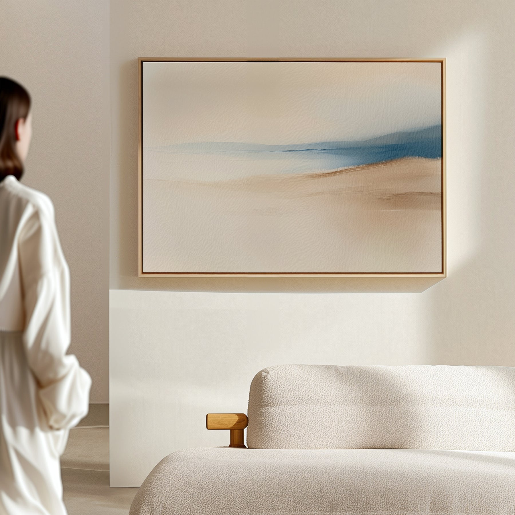 A person in a white outfit stands near a beige sofa, admiring the Golden Drift Canvas Art – Horizontal featuring soft beige and blue tones on a light-colored wall in a modern, minimalistic living room.