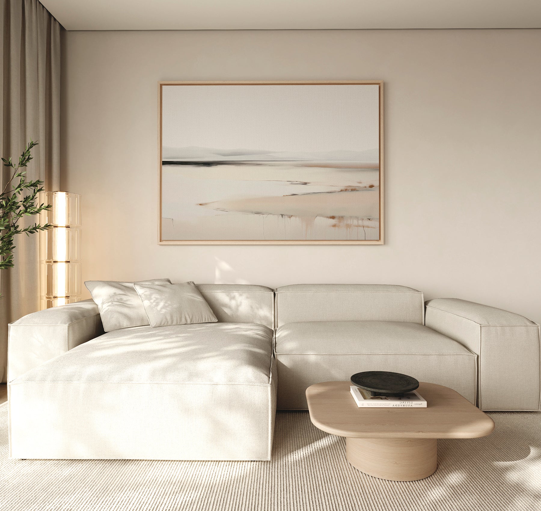 A modern living room features a light beige sectional sofa, wooden coffee table, black bowl, tall plant, and the Quiet Valley Canvas Art – Horizontal. Neutral hues and minimalist elegance create a calm, inviting atmosphere.