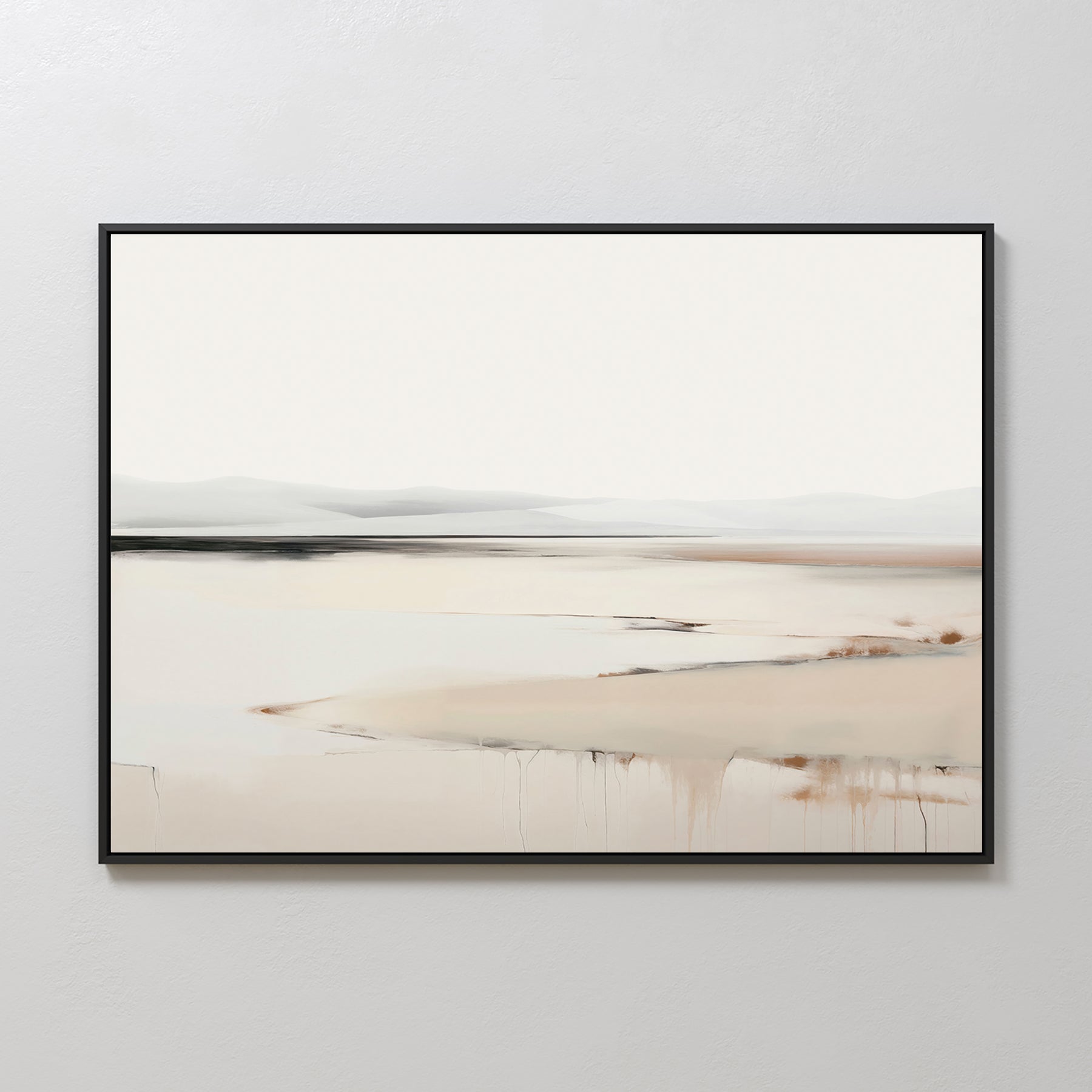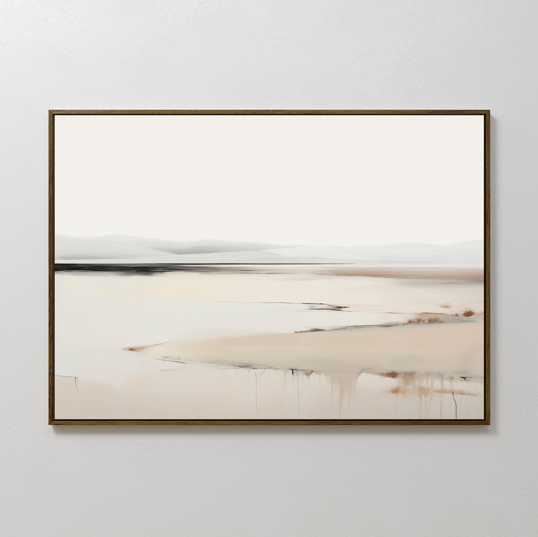 Minimalist elegance defines the Quiet Valley Canvas Art – Horizontal, featuring a serene landscape in soft beige and gray. Abstract hills and subtle paint drips evoke quiet reflections—perfect for sophisticated living room decor.