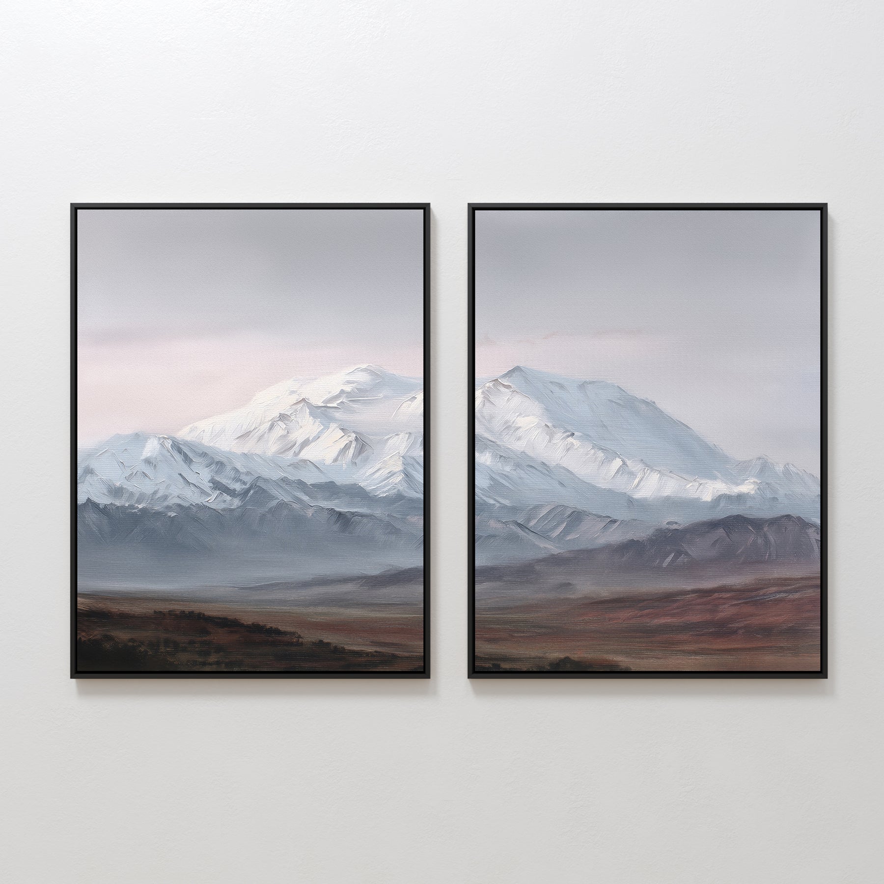Alpine Majesty - Set of 2: Framed mountain canvas prints showcase snow-capped peaks under a cloudy sky with brown and green plains—ideal mountain wall art for Nordic Park-inspired decor.