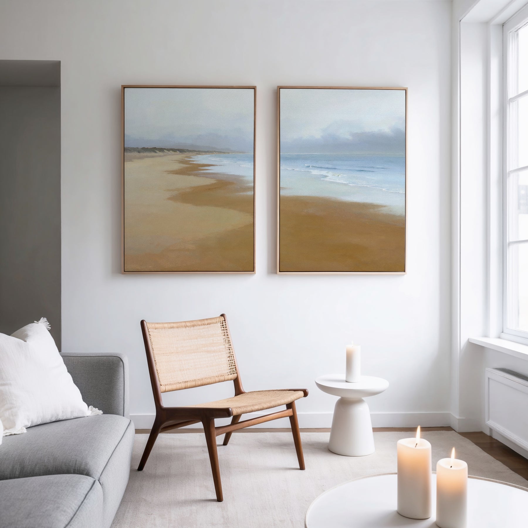A modern living room with a gray sofa, wicker chair, small white side table, and three lit candles. "Endless Shoreline - Set of 2" serene coastal wall art hangs above the chair. Natural light brightens the Nordic-inspired space.