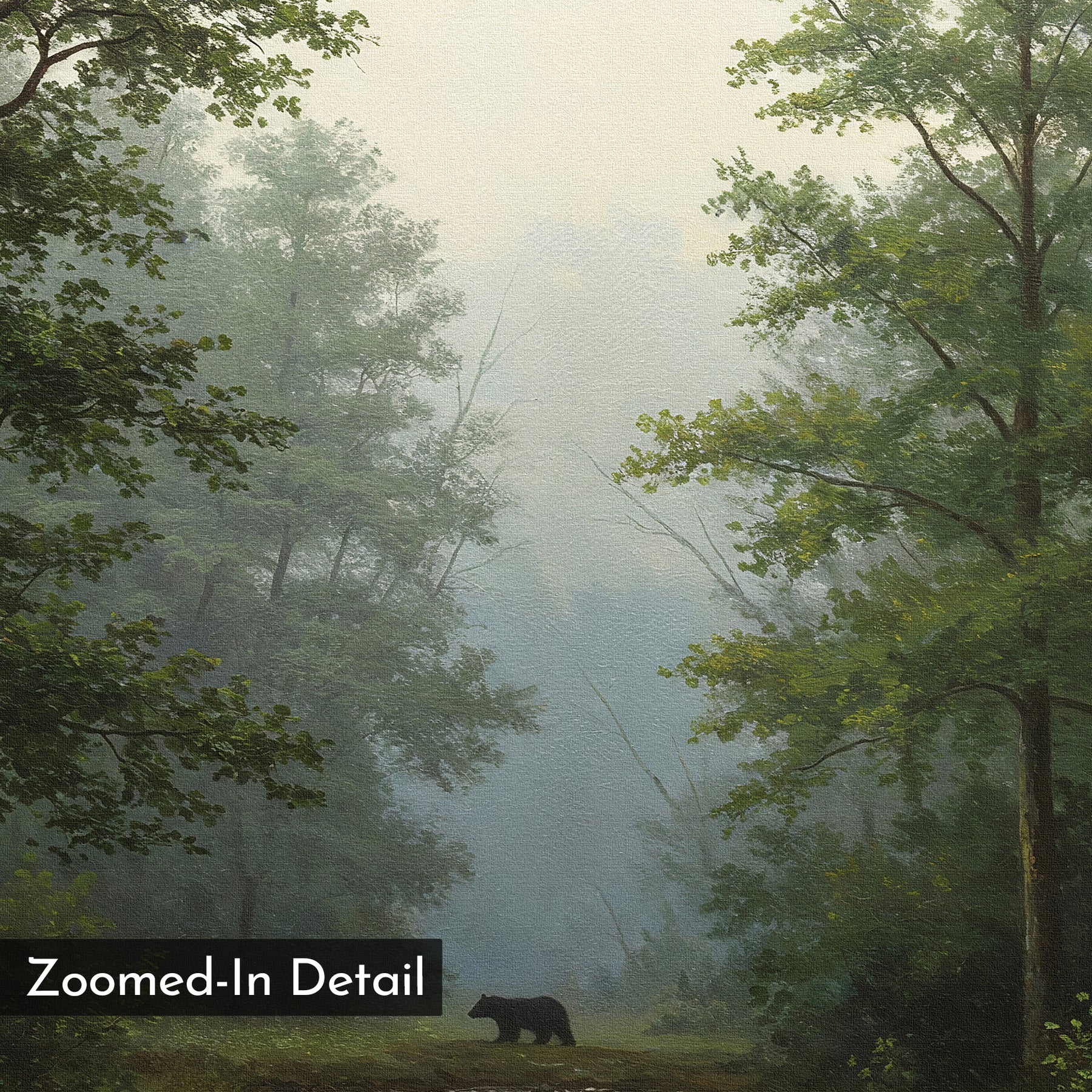 A misty forest with tall green trees and a small black bear walking below. Soft light filters through the fog for a serene mood. Forest Passage Canvas Art—ideal as rustic bedroom decor or forest green wall art. "Zoomed-In Detail" in lower left corner.
