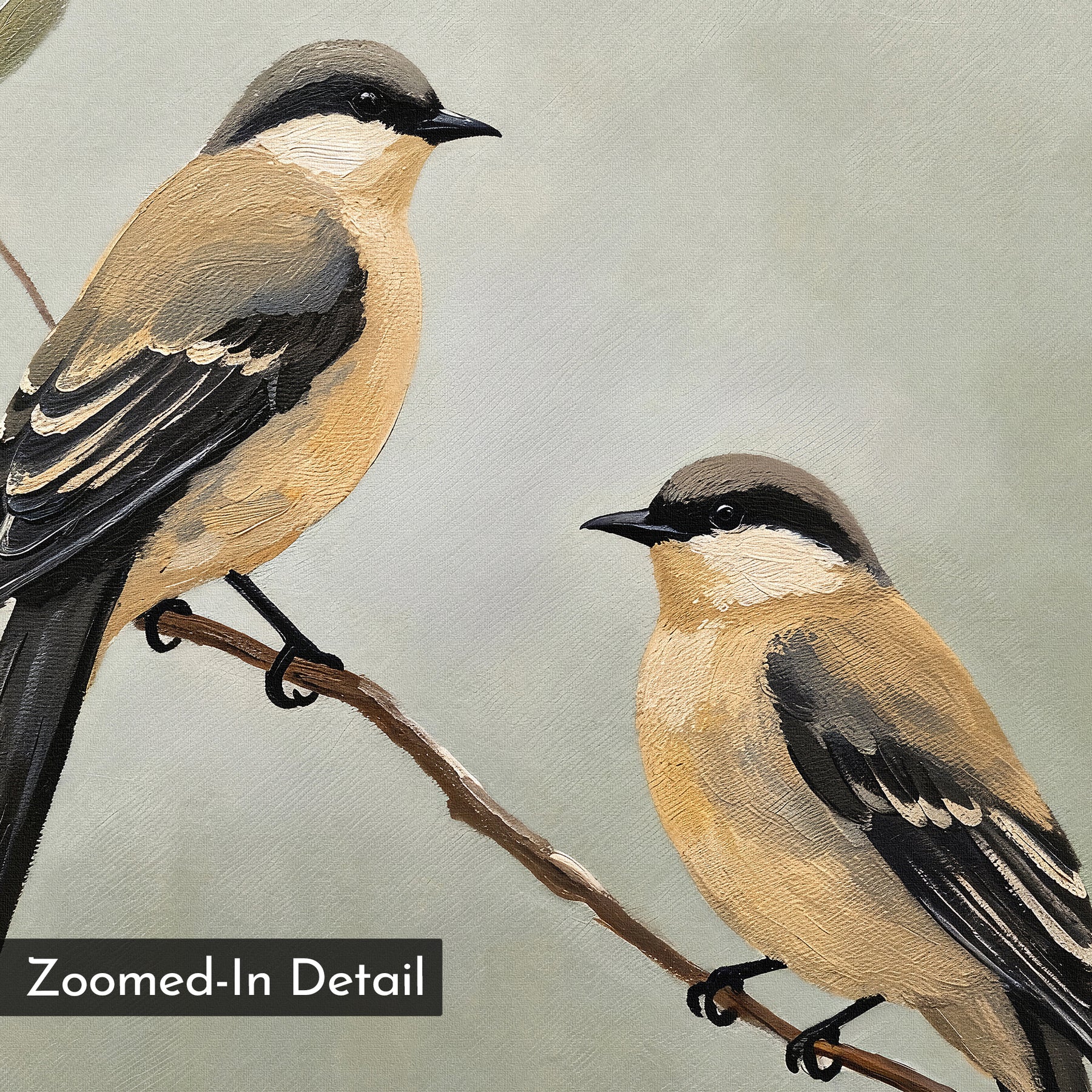 Garden Pair Canvas Art features two tan and brown birds with black markings perched on a leafy branch, set against a soft green background. Ideal as living room decor, it brings serene Nordic Park beauty to your space.