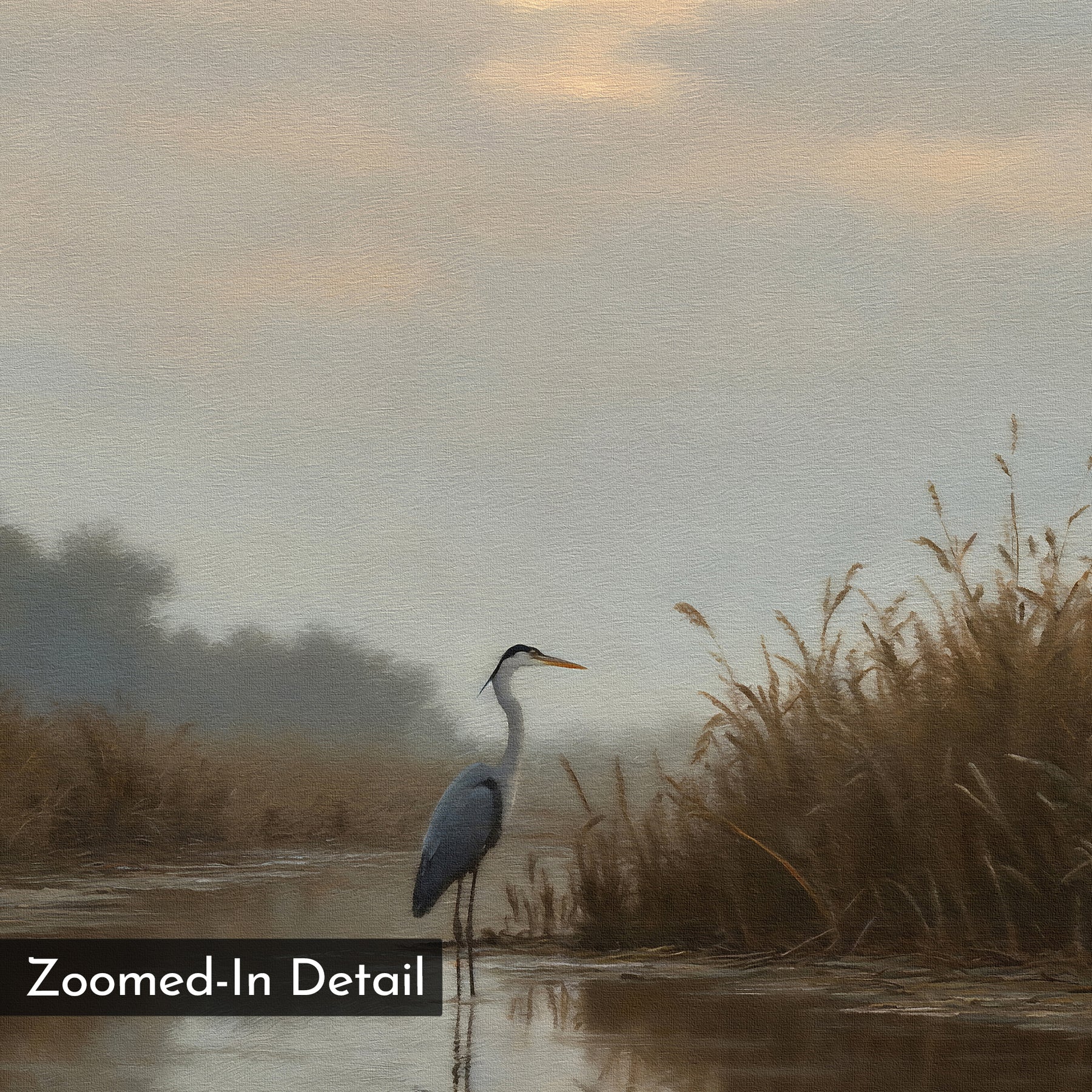 Misty Reflection Canvas Art shows a heron in shallow water at sunrise by tall grasses under a misty sky. Muted colors and painterly style make it ideal wall art for neutral decor. “Zoomed-In Detail” text appears in the bottom left corner.