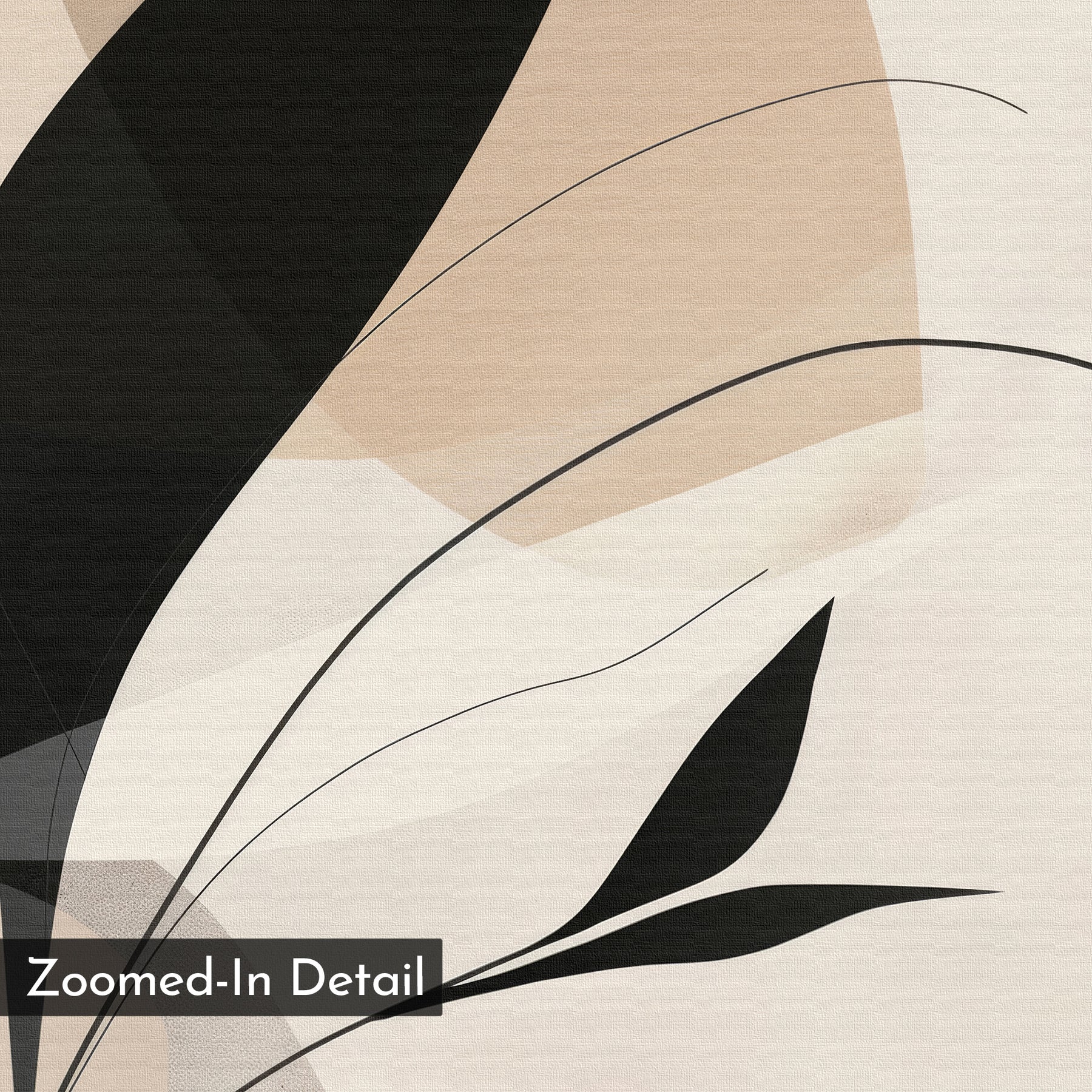 Noir Petals in Motion Abstract Canvas Art features overlapping beige, black, and cream shapes with thin, curved black lines like plant stems on a canvas-like texture—ideal modern wall art for elegant living room decor. Label: Zoomed-In Detail.