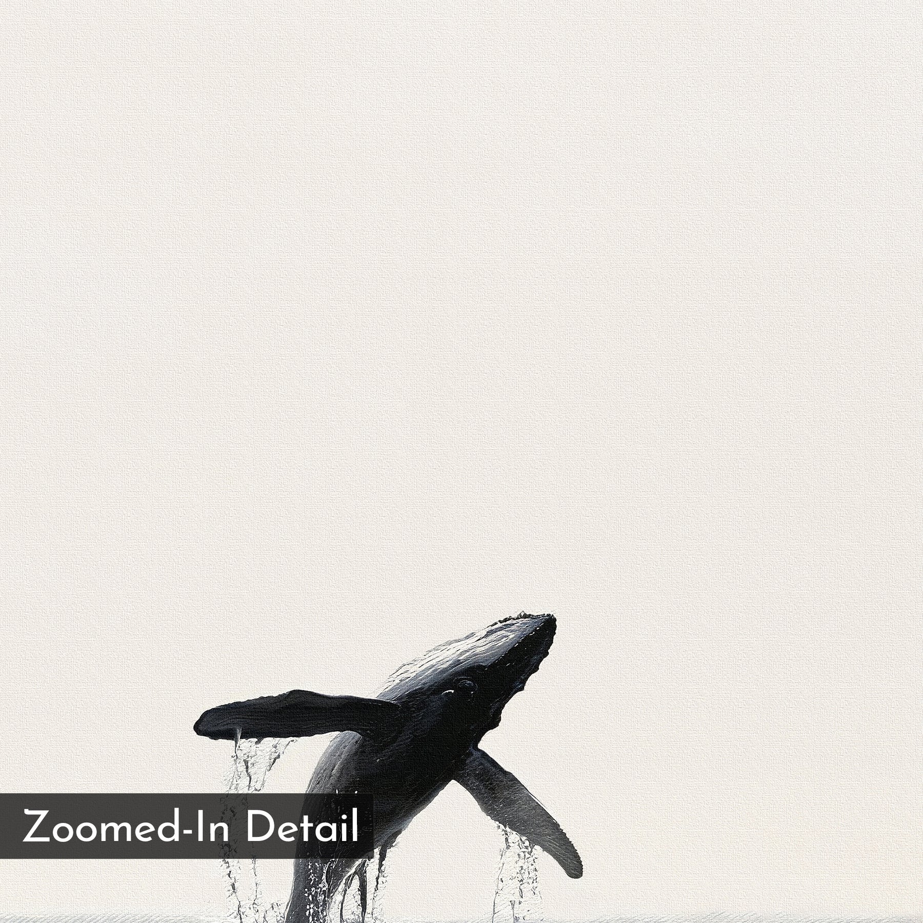 The Ocean Leap Canvas Art shows a whale breaching over the ocean, water splashing against a light background—a minimalist piece to elevate your living room. “Zoomed-In Detail” is labeled in the bottom left corner.